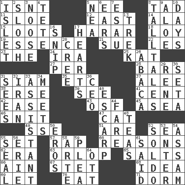 ACROSS 1. Is not 5. Born 8. Small boy 11. _ gin 12. 90 degrees 14. Chicken ___ king 15. Plunders 17. Ethiopian city, capital of Harari 18. Myrna of the movies 19. Gist 21. Institute legal proceedings 22. French article 23. Definite Article 24. Lyricist Gershwin 25. Krazy ___ of comics 27. For each 28. Long, evenly shaped pieces 31. Thailand, formerly 35. And so on (abbr.) 37. Toward shelter 38. Celtic language 39. Observe 41. Penny 42. Relaxation 43. Order of Saint Francis (abbr.) 45. Toward the sea 46. In a ____ (agitated or irritated) 47. Domesticated feline 49. Compass dir. 51. "We ___ not amused" (Victoria) 52. Ocean 55. Arrange properly for use 57. Reproach for some lapse or misdeed 60. Thinks logically 62. Period 63. Fourth or lowest deck 65. Table seasonings 66. The 18th letter of the Arabic alphabet 67. Proofreading order 68. It may be bright or harebrained 69. Allow 70. Consume 71. Dormintory (informal) DOWN 1. Small island 2. Make a splashing sound 3. Trap for birds or small mammals 4. False hair 5. Teachers' org. 6. Hearing organs 7. He sold his birthright 8. Baron Munchausen's specialties 9. Medicinal plant 10. 24-hour periods 13. Long journey 16. Sever or remove by pinching or nipping 17. Centers 20. Algonquian 26. Phillipine bananalike plant 29. French philosopher Descartes 30. Stalk of a moss capsule 31. Observes 32. SW Asia republic 33. Helper 34. Confronts 36. Corporate head (abbr.) 40. Fortification 44. Conductor's collection 48. Afternoon social gatherings 50. Greek god of love 52. Twentieth part of a lira 53. Keyboard key 54. Indian state 55. Lick closed 56. 4th largest of the Great Lakes 58. Johnson of "Laugh-In" 59. Entreaty 61. Stated 64. Baseball player Mel