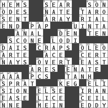 ACROSS 1. Is hesitant and indecisive 5. Wither 9. Male offspring 12. Lyric poems 13. Nathan's nickname 14. Pacific island yam 15. Posted 16. Like ___ of sunshine 17. Monetary unit of Yemen 18. Conclusion 19. Infant food 21. National forest in Provo, Utah 22. Of or related to the anus 24. Lair 26. "___ Little Indians" 27. Biscuitlike quick bread 28. Farming town in central California 29. Raised platform 30. Dice game 32. Margarine 36. Johnson of "Laugh-In" 37. Adept person 38. Foregone conclusion 39. Negative votes 40. Unconcealed 42. Compass direction 43. Ancient Greek god of war 44. Maternal 46. Auto club (abbr.) 49. Personal Computers (abbr.) 50. Hyperbolic tangent 51. Small fatty European fish 53. Cask 54. Connecticut Ivy Leaguer 57. The Jewish people; Israel 58. Otherwise 61. SW Asia republic 62. Relaxation 63. Louse (plural) 64. To provide with a ceiling 65. Compass dir. 66. Chow _ 67. Whirlpool DOWN 1. Stockings 2. Paradise 3. Ananias' fault 4. Fast jet (abbr.) 5. Fastener 6. Ewer handle 7. _ moment's notice (2 wds.) 8. Marina Del _, California 9. Inhabitant of Heaven 10. Speak pompously 11. Pitcher Ryan 14. Three (prefix) 19. Baking dish 20. Actor Baldwin 21. Corn or form start 23. Olfactory organs 24. Drug addict 25. Begley and Asner 27. "Two Mules for Sister ____" 28. Shoestrings 29. Daniel's nick name 31. All-night dance parties 32. Sea 33. Tough but pliablecoriaceous 34. Celtic language 35. Baseball player Mel 40. The grampus (Milton) 41. Wig 43. Fitting 45. Tired old horse 46. NE Netherlands city 47. Bee-related 48. Came up 52. A saturated hydrocarbon 53. Peachy ____! 55. Put down 56. Inwardly 58. Shade tree 59. Falsehood 60. _-fi 61. Frozen water