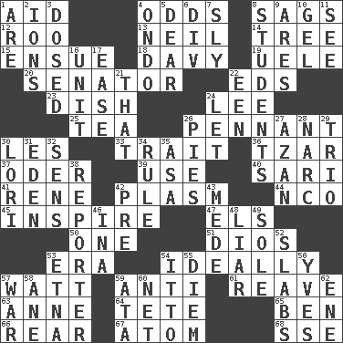 ACROSS 1. Assist 4. Probability 8. Settles 12. Friend of Pooh 13. Famous astronaut Armstrong 14. Relationship diagram 15. Follow as a consequence or result 18. _ Jones' Locker 19. Ubangi River tributary 20. Legislator 22. Begley and Asner 23. Food container 24. Area sheltered from the wind 25. Afternoon social gathering 26. Pre-World Series prize 30. French article 33. Distinguishing feature 36. Russian ruler 37. Baltic tributary 39. Purpose 40. Indian skirt 41. French philosopher Descartes 42. Suffix with ecto or cyto 44. Non-commissioned officer (abbr.) 45. Stimulate to action 47. Raised railways 50. Single 51. "Vaya con ____" 53. Epoch 54. Under perfect conditions 57. Electrical Unit 59. Against 61. Rob, plunder, or pillage 63. Singer Murray 64. Wig 65. Benjamin's nick name 66. Buttocks 67. Smallest unit of an element 68. Compass dir. DOWN 1. "We ___ not amused" (Victoria) 2. Charged atoms 3. Administered medicine 4. Southwest Nigerian state 5. Letter starter 6. HTML Container Element 7. Secret 8. SAT takers 9. Ancient Greek god of war 10. Set 11. Observe 16. A single undivided whole 17. Relaxation 21. Not this but _ 22. Car or cant ending 24. Allow 26. Sliced desserts 27. Muslim summons to prayer 28. Drug cop 29. Musical group of three 30. Australian parrot (variant) 31. Locale of original sin 32. Elected reps. 34. General guideline 35. White ___ sheet 38. News announcer 42. Before (prefix) 43. Ancient Persian 46. _ tizzy (2 wds.) 48. One who doesn't tell the truth 49. Not divided or shared with others 52. Thick slices 53. Inactive volcano in Sicily 54. "Tell ____ the Marines!" 55. South Vietnam president (1954) 56. Jacques Cousteau's middle name 57. Armed conflict 58. One (Scot) 59. _ moment's notice (2 wds.) 60. Fish or hair follower 62. Compass dir.