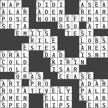 ACROSS 1. Atlas unit 4. "You Light Up My Life" star Conn 8. Toward the sea 12. Having or resembling wings 14. Arabian gulf 15. Stern 16. Introduce or present, as a question 17. Unrelated to defense, as in spending 20. Stalk of a moss capsule 21. Bear (Spanish) 22. "One Day ___ Time" 23. Gives off 27. Trial 29. Cause heat under the collar 31. Tennis shots 34. _____ Park, CO 35. Ancient Greek god of war 36. Taken by mouth 39. Male parent 41. Is not 42. Chilled 43. Japanese brewing company 46. Lacquered or enameled metalware 47. Austrian river, tributary to the Danube 48. Mouths or openings 51. Desist 54. Nonscientific branch of learning 56. Adept person 58. The sixth month of the Jewish calendar 61. Happening in regular succession 66. Light colored 67. So be it 68. Writer Wiesel 69. Thick slice 70. Broke a traffic law 71. Pinches, bites 72. Followers of ems DOWN 1. Atlas contents 2. Medicinal plant 3. Thick mixture 4. Daniel's nick name 5. Wedding promise 6. Lair 7. _ china 8. "We ___ not amused" (Victoria) 9. Elected representatives 10. Compass direction 11. Type of rug 13. 480, 500 or 516 sheets of paper 18. Eastern Standard Time (abbr.) 19. Enemy 24. Big collection agency 25. Teat (slang) 26. Downhill vehicle 28. Killed 30. 1973 Nobel Price Winner (Physics) Leo 32. Benjamin's nick name 33. Fast jet (abbr.) 34. A person who is older than you are 36. Sep. follower 37. Friend of Pooh 38. One to whom something is allotted 40. Compact _ 44. Actress Charlotte 45. Retirement account (abbr.) 49. Fitting 50. Indian title of respect (Mr.) 52. Plant excrements 53. Peak District village in England 54. Caspian sea tributary 55. Play 57. Baking chamber 59. ____ Jay Lerner 60. Confederate soldiers (slang) 62. Plus 63. Connecticut Ivy Leaguer 64. Mouth edge 65. It is so