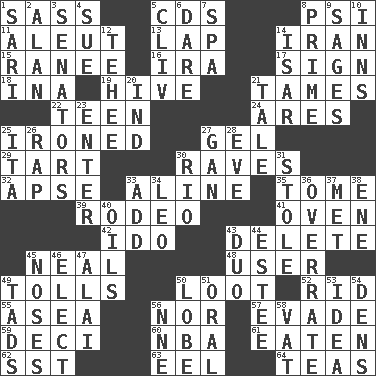 ACROSS 1. Backtalk 5. Music discs 8. 23rd letter of the Greek alphabet 11. Eskimo relative 13. Pet locale 14. SW Asia republic 15. Indian princess (variant) 16. Lyricist Gershwin 17. Attach a signature 18. _ tizzy (2 wds.) 19. Hub of activity 21. Domesticates 22. Adolescent 24. Ancient Greek god of war 25. Pressed 27. Set 29. Small pie 30. All-night dance parties 32. Domed church section 33. Place in a line 35. Heavy book 39. Cowboy competition 41. Baking chamber 42. Wedding promise 43. Erase 45. Actress Patricia 48. One who uses or employs something 49. For Whom the Bell _____ 50. Spoils 52. To free from 55. Toward the sea 56. Or not 57. Dodge 59. Tenth: prefix 60. Basketball assoc. 61. Consumed 62. Fast jet (abbr.) 63. Snakelike fish 64. Beverages made from leaves DOWN 1. Indian skirt 2. Actor Alda or Thicke 3. Legislators 4. Take to court 5. 154 in Roman numerals 6. Have the gumption 7. Health resort 8. A-one 9. Gurus 10. Lodging establishments 12. Giggle 14. Austrian river, tributary to the Danube 20. Working for oneself (abbr.) 21. Lie 23. Keyboard key 25. Call ___ day 26. Strike 27. Separate the seeds from cotton 28. First lady 30. _ de Janeiro 31. Took without asking 33. Increase 34. Lion 36. Make much ado about nothing 37. Was introduced to 38. Compass dir. 40. Petroleums 43. Superhero pair 44. First name in cosmetics 45. Olfactory organs 46. Choose 47. Jai ____ 49. Small boys 50. Ear part 51. Spoken 53. It may be bright or harebrained 54. Hiding places for outlaws 56. Compass dir. 58. Large container