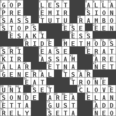 ACROSS 1. Republican Party 4. For fear that 8. Silent film actress Nazimova 12. Before (prefix) 13. Arab leader 14. The Jewish people; Israel 15. Backtalk 17. Ballerina skirt 18. Role for Stallone 19. Closes up, plugs up 21. Compass dir. 23. Car or cant ending 24. 1973 Nobel Price Winner (Physics) Leo 26. Double-curved letter 28. Travel on or in a vehicle 30. Modes 34. _ Lanka 37. Comfort 39. Part of Q.E.F. 40. Apertif with cassis 41. Indian state 43. "We ___ not amused" (Victoria) 44. Having or resembling wings 46. Inactive volcano in Sicily 47. Fish or hair follower 48. Commissioned military rank 51. Russian ruler of old 54. Ingest 55. Marketplace scale 58. University (slang) 61. Put into a specified state 63. Garlic unit 65. Something which is sent 67. Length times width 71. Enthusiasm 72. Singer James 73. Abrupt rush of wind 74. Find the sum of 75. Have trust in 76. Bristle 77. Modern: prefix DOWN 1. Global Positioning Systems (abbr.) 2. Speak pompously 3. Mexican monetary units 4. Allow 5. Australian flightless bird 6. Be seated 7. Loyal 8. White ___ sheet 9. Welles in "The Third Man" 10. Ear part 11. At once, immediately (arch.) 16. Coast Guard woman 18. State of inaction 20. What Jean-Claude Killy likes to do 22. Perceive with the eye 25. The content of cognition 27. A female animal or person 29. Artist's stand 30. Intended 31. NW Algerian seaport 32. Have the gumption 33. Proofreading order 34. Heroin 35. Cause heat under the collar 36. SW Asia republic 38. Fast jet (abbr.) 42. Vertical spar for supporting sails 45. Portuguese money of account (variant) 49. Raze (variant) 50. Had dinner 52. Curve 53. Hero or heavy, e.g. 56. Pitcher Ryan 57. Dodge 58. One who makes use of a thing 59. Make mention of 60. International (abbr.) 62. Labels 64. Inside; within (prefix) 66. 24 hours 68. Regret 69. Eastern Standard Time (abbr.) 70. _ moment's notice (2 wds.)