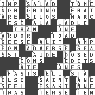 ACROSS 1. Naughty child 4. Vegetable dish 9. Heavy book 13. Or not 14. U. of Maine site 15. Part of Q.E.F. 16. "We ___ not amused" (Victoria) 17. Grain storage towers 18. Drug cop 19. Compass dir. 21. Chicken ___ king 22. Dipping utensil 24. SW Asia republic 26. Single 27. Zeal 29. Frog relative 30. Honkers 31. Set down 33. Electrical Unit 36. Period of immesurable duration 37. Contrary to your interests or welfare 40. Ocean 41. Fast jet (abbr.) 42. Assistant 43. Administered medicine 45. Immeasurably long periods of time 47. Proofreads 48. Had dinner 49. Washington bills 50. Goes without food and/or water 52. Connecticut Ivy Leaguer 54. R.R. building 56. Otherwise 57. Virtuous person 59. One (Scot) 61. Stitch closed the eyes of (a falcon) 62. 1973 Nobel Price Winner (Physics) Leo 63. Compass dir. 64. It was, poetically 65. Laconic 66. "___ Little Indians" DOWN 1. _ tizzy (2 wds.) 2. Greater amount 3. Elected leader of a country 4. Mayday 5. Believer in; advocate of (suffix) 6. Hang loosely or laxly 7. Small Philippine buffalo 8. Two (Sp.) 9. Looked after 10. Taken by mouth 11. Female horse 12. And so on (abbr.) 20. Greek god of love 22. Plunders 23. Santa ___, CA 25. Type of rug 27. Matures 28. Vintage cars 29. Hoop that covers a wheel 31. Deliberation 32. Directed 33. Helper 34. Rendezvous 35. Writing tablets 38. Natives or inhabitants of Denmark 39. Genesis locale 44. Lyric poems 45. Artist's stands 46. Baseball player Mel 49. Pig sounds 50. Soared 51. At sea 52. Relaxation 53. One who doesn't tell the truth 55. Queen of England 1702-14 56. Eastern Standard Time (abbr.) 57. Arrange properly for use 58. Make a knot 60. Car or cant ending