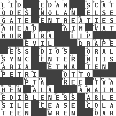 ACROSS 1. Hat (slang) 4. Dutch treat 8. Jazz singing style 12. Lyric poems 14. Pitcher Ryan 16. Otherwise 17. Yard entry 18. Pleas 20. At or in the front 22. Direct toward a target or goal 23. Large container 24. And not 25. Lyricist Gershwin 28. Mouth edge 30. Morally bad or wrong 31. Window treatment 35. Curvy letter 37. "Vaya con ____" 40. Relating to the mouth 41. Synchronize (abbr.) 42. Keyboard key 44. Nuclear Threat Initiatives 45. Roberta Peters solo 46. Inactive volcano in Sicily 47. Nine, plus one 48. _ dish (used to culture cells) 50. "Beetle Bailey" pooch 52. Parent Teacher Association (abbr.) 54. To separate or throw off 55. Federal power corp. 58. Layer 61. Wing 63. At full speed 65. The property of being fit to eat 70. Competent 71. Drop; flow; fall 72. Stop 73. Root beer relative 74. Adolescent 75. Songbird 76. Rowing implement DOWN 1. Utah city north of Ogden 2. Potato state 3. Prevent from occurring 4. Compass dir. 5. Spanish title 6. The first octave above the treble staff 7. Hindu Mythology: god of death 8. Arrange properly for use 9. 154 in Roman numerals 10. At sea 11. Trial 13. Ocean 15. Famous astronaut Armstrong 19. Among 21. HTML Container Element 26. Travel on an animal 27. Place in a line 29. Right away 30. Fortification 32. Johnson of "Laugh-In" 33. Ache 34. Raised railways 35. Jane of fiction 36. In a ____ (agitated or irritated) 38. Baseball player Mel 39. Sir (Sp.) 41. Plant excrement 43. Assign a rank or rating to 49. Slanted text style (abbr.) 51. Afternoon social gathering 53. Actor Baldwin 55. Off limits 56. Country residence 57. Approach 58. Command 59. Singer Brickell 60. "Death on the ____" 62. Afresh 64. Big _ 66. Benjamin's nick name 67. Ewer handle 68. Compass dir. 69. Elected rep.
