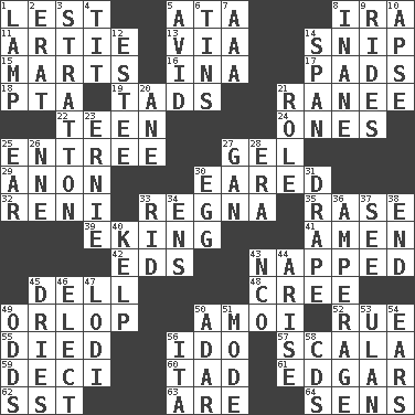 ACROSS 1. For fear that 5. _ moment's notice (2 wds.) 8. Retirement account (abbr.) 11. Nick name for Arthur 13. By way of 14. Clip 15. Shops 16. _ tizzy (2 wds.) 17. Groovy apts. 18. Parent Teacher Assoc. 19. Bits 21. The wife of a rajah (variant) 22. Adolescent 24. Singles 25. Main course 27. Set 29. Soon (poet.) 30. Having ears or earlike features 32. Painter Guido (1575-1642) 33. Canadian anthropologist Darnell 35. Raze (variant) 39. Supplementing with great effort 41. So be it 42. Begley and Asner 43. Slept 45. Small valley 48. Algonquian 49. Fourth or lowest deck 50. Mine, in Marseilles 52. Regret 55. Passed on 56. Wedding promise 57. Any of the three canals of the cochlea 59. Tenth: prefix 60. Small amount or degree 61. _ Allan Poe 62. Fast jet (abbr.) 63. "We ___ not amused" (Victoria) 64. Elected reps. DOWN 1. Desk light 2. Part of Q.E.F. 3. Ski resort town in Vermont 4. Teat (slang) 5. Enthusiastic 6. Metal containers 7. Auto club (abbr.) 8. Lacking in sense or substance 9. Amusement-park features 10. Domed church section 12. First name in cosmetics 14. Connect, as a bridge 20. A saturated hydrocarbon 21. Hero or heavy, e.g. 23. Bert's buddy 25. Ewer handle 26. Compass dir. 27. Separate the seeds from cotton 28. Period 30. Ovum 31. Window treatment 33. To free from 34. Followers of ems 36. Electrical Measurement 37. Perceive with the eye 38. Conclusion 40. Seaweed 43. Non-commissioned officer (abbr.) 44. Ascend 45. Frees from moisture 46. Voters do this 47. Farming town in central California 49. Probability 50. The sixth month of the Jewish calendar 51. Method 53. ____ Bator, Mongolia 54. Hearing organs 56. Call ___ day 58. Music discs