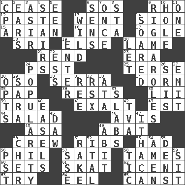 ACROSS 1. Stop 6. Mayday 9. 17th letter of the Greek alphabet 12. Thick mixture 13. Gone 14. The Jewish people; Israel 15. Believer in; advocate of (suffix) 16. South American Indian 17. Stare 18. _ Lanka 19. Otherwise 20. Unable to walk 21. Tear apart 23. Epoch 24. Inconspicuous attention getter 25. Laconic 28. Bear (Spanish) 30. Father Junipero _ 34. Dormintory (informal) 35. Infant food 36. Musical pauses 38. Cards in a Roman deck? 39. Loyal 41. Glorify 43. Eastern Standard Time (abbr.) 44. Vegetable dish 46. Opinion 48. White ___ sheet 49. Blind as ____ 50. Ship's personnel 51. Chest bones 53. Possessed 56. Silvers or Donahue 57. Suttee (variant) 58. Domesticates 60. Puts into a specified state 61. Three-handed card game 62. Ancient Celtic tribe of eastern Britain 63. Attempt to accomplish something 64. Snakelike fish 65. 2nd pers. sing. pres. of can (arch.) DOWN 1. Numbers guy (abbr.) 2. Hearing organs 3. SW Saudi Arabia district 4. Flight of steps 5. Car or cant ending 6. Elected reps. 7. At one time in the past 8. R.R. building 9. Complicated, petty procedures 10. Opening into or through something 11. Single 13. Rampant 14. Flew 19. Keyboard key 20. Allow 22. Double-curved letter 24. Teen's desire 26. Indian titles of respect 27. Send forth 28. Elects 29. "Two Mules for Sister ____" 31. Portuguese money of account (variant) 32. Acura sports coupe 33. _ moment's notice (2 wds.) 37. Thick slices 40. Artist's stands 42. Federal power corp. 45. Obsolete 47. New York city 49. "This won't hurt ____!" 50. "Mermaids" star 51. Immoral or dissolute person 52. Slanted text style (abbr.) 54. So be it 55. Cub Scout units 56. Pacific Standard Time (abbr.) 57. Compass dir. 58. Nervous spasm 59. Be seated