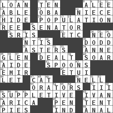 ACROSS 1. Grant temporary use of 5. "___ Little Indians" 8. Toward shelter 12. Competent 13. Chief or king in Benin or Nigeria 14. Sibling's daughter 15. Flintstone garb 16. Census information 19. Portuguese money of account (variant) 20. Elected representative 21. Indian titles of respect 23. And so on (abbr.) 24. Modern: prefix 27. Nuclear Threat Initiatives 30. Texas town _ City 31. Michaelmas daisies 34. Singer Murray 35. Small, secluded valley 38. Started a card game 40. Fly high 41. Helper 42. Soup utensils 44. Arab leader 45. Needle case 46. Allow 47. Feline 50. 1994 drama film starring Jodie Foster 53. Speakers 57. One more than two 59. Supplying deficiencies 63. "Terrible" tsar 64. N. Chile seaport 65. Writing instrument 66. Portable shelter 67. Sliced desserts 68. Working for oneself (abbr.) 69. Of or related to the anus DOWN 1. Cowardly lion portrayer 2. Off-Broadway awards 3. Tree or shrub in the Birch family 4. Born 5. Drink excessively 6. Inky black, to poets 7. California wine valley 8. Small island 9. Flowery wreath 10. Environmental prefix 11. Car or cant ending 14. Drug cop 17. Shoshoni 18. Car dealer's back yard 20. Fast planes 22. More lacking in sense or substance 24. Words to Nanette 25. Pulitzer Prize-winning author Ferber 26. River in Europe 28. It would 29. Observes 30. Small ungulate mammals of Africa 32. Strike 33. A type of plum 35. Highlander 36. Welles in "The Third Man" 37. Prepare for publication 39. Small child 43. Religious women 47. Root beer relative 48. "We ___ not amused" (Victoria) 49. Make lace 51. Make or become more lively 52. Woody, climbing, usually tropical plant 54. Native american tent (variation) 55. Baking chamber 56. Tear apart 58. International (abbr.) 59. Plant excrement 60. RI univ. 61. Sliced dessert 62. Personal Computers (abbr.) 63. Call ___ day