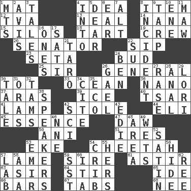 ACROSS 1. Floor protector 4. The content of cognition 8. Detail 12. Federal power corp. 13. Actress Patricia 14. Grandmother 15. Grain storage towers 18. Small pie 19. Ship's personnel 20. Elected representative 22. Small drink 23. Bristle 24. Partially opened flower 25. Title for a knight 26. Commissioned military rank 30. Small child 33. Sea 36. Billionth: prefix 37. Caspian sea tributary 39. Frozen water 40. Russian ruler of old 41. Desk light 42. Fur scarf 44. Connecticut Ivy Leaguer 45. Gist 47. Simpleton 50. Cuckoo 51. Angers 53. Supplement with great effort 54. Leopard's kin 57. Unable to walk 59. Beget 61. Being in motion 63. SW Saudi Arabia district 64. Use a spoon 65. Binary compound 66. Oblong pieces of solid material 67. Bar bills 68. Born DOWN 1. Mountains (abbr.) 2. Deliberation 3. Lies 4. To the inside or interior of 5. Letter starter 6. Ewer handle 7. The first octave above the treble staff 8. Event 9. Canvas cover 10. Compass dir. 11. Informal term for the mouth 16. Singles 17. Suttee (variant) 21. Pacific island yam 22. Player for Phoenix 24. Benjamin's nick name 26. Highlander 27. Raze (variant) 28. Of or related to the anus 29. Australian parrot (variant) 30. Story 31. Mouths or openings 32. Scottish caps 34. Quote 35. Environmental prefix 38. Orators 42. _-fi 43. Singer Brickell 46. Compass dir. 48. Length times width 49. Soaks 52. Smooth fabric 53. Independent ruler or chieftain 54. Baby bed with high sides 55. Possessive pronoun 56. Flintstone garb 57. Experiment locale 58. White ___ sheet 59. Fast jet (abbr.) 60. Call ___ day 62. To sift
