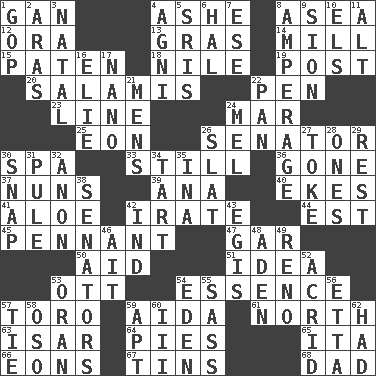 ACROSS 1. Separate the seeds from cotton 4. American tennis player Robert 8. At sea 12. Mouth or opening 13. Pate de foie ____ 14. Place where flour is made 15. Eucharist need 18. "Death on the ____" 19. Mail 20. Deli grouping 22. Writing instrument 23. Actor's bit 24. Make imperfect 25. Age 26. Elected representative 30. Health resort 33. Not moving 36. Went 37. Religious women 39. Santa ___, CA 40. Supplements with great effort 41. _ vera 42. Feeling or showing extreme anger 44. Eastern Standard Time (abbr.) 45. Pre-World Series prize 47. Slender fish 50. Help 51. It may be bright or harebrained 53. Baseball player Mel 54. Substance 57. "Corrida" creature 59. Opera by Verdi 61. Compass direction 63. Austrian river, tributary to the Danube 64. Sliced desserts 65. Call ___ day 66. Immeasurably long periods of time 67. Metal containers 68. Male parent DOWN 1. Republican Party 2. Caspian sea tributary 3. Relating to or accompanying birth 4. Hindu god of fire 5. Indian titles of respect 6. Actor Linden 7. Compass dir. 8. Electrical Measurement 9. The Jewish people; Israel 10. Raised railways 11. The first octave above the treble staff 16. Writer Wiesel 17. Billionth: prefix 21. Not women's 22. Baking dish 24. Cartoonist voice _ Blanc 26. Narrow board 27. Casino tip 28. Singles 29. Relief 30. Fastener 31. Whine 32. Soon (poet.) 34. Small pie 35. _ tizzy (2 wds.) 38. Elected representatives 42. Working for oneself (abbr.) 43. The front part of a cuirass 46. Small island 48. Arabian gulf 49. Western Nevada city 52. Sour-tasting 53. NW Algerian seaport 54. Locale of original sin 55. Backtalk 56. Singer James 57. Standoff 58. Bear (Spanish) 59. Fitting 60. One more than two 62. Possessed