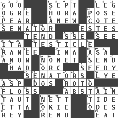 ACROSS 1. Thick or sticky substance 4. Back-to-school mo. 8. Part of a journey 11. Legendary monster 13. Israeli folk dance 14. Introduce or present, as a question 15. Lightbulb-shaped fruit 16. Afresh 17. ____ d'Azur (French Riviera) 18. Legislator 21. _____ Park, CO 22. Look after 23. Compass dir. 25. Observe 26. Call ___ day 29. A testis 32. Indian princess (variant) 34. _ tizzy (2 wds.) 35. White ___ sheet 38. At once, immediately (arch.) 39. Music written for nine 41. Transmit 43. Possessed 44. The grampus (Milton) 45. Morally degraded 46. Elected representatives 50. Sodium hydroxide 51. Cleo's killer 54. Two (Sp.) 55. Printing process, for short 57. Soft thread for cleaning between teeth 59. Refrain by choice 63. Drawn tight 64. Remaining after all deductions 67. Periodic rise and fall of the sea level 68. Singer James 69. Migrant worker of the '30s 70. Lyric poems 71. Marina Del _, California 72. Tear apart 73. Ingest DOWN 1. Republicans 2. Double curve, resembling the letter S 3. Northwest Algerian city 4. Broken pieces 5. Period of immesurable duration 6. Before (prefix) 7. The 23rd letter of the Hebrew alphabet 8. Plunders 9. First name in cosmetics 10. Honkers 12. Part of Q.E.F. 14. Personal Computers (abbr.) 19. False hair 20. Single 21. Snakelike fish 23. Trig term 24. Get outta here! 26. Retirement account (abbr.) 27. Hyperbolic tangent 28. Small Philippine buffalo 30. Colored lightly or faintly 31. Relaxation 33. Extremities 36. Sew up the eyelids of hawks and falcons 37. Actor Griffith 39. Words to Nanette 40. Mouths or openings 42. Color 45. Fast planes 47. Begley and Asner 48. Spoke pompously 49. Director Reiner 51. Following 52. Schedule 53. Marked by pouting 56. Von Bismarck 58. R.R. building 60. Helper 61. It may be bright or harebrained 62. Egg locale 64. Or not 65. Make supply last 66. Shallow baking pan