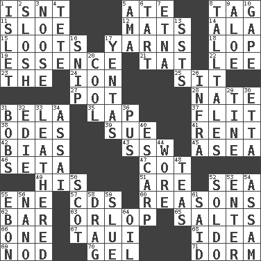 ACROSS 1. Is not 5. Had dinner 8. Label 11. _ gin 12. Floor protectors 14. According to 15. Plunders 17. Entertaining tales 18. Chop off 19. Substance 21. Make lace 22. Area sheltered from the wind 23. Definite Article 24. Electrically charged atom 25. Be seated 27. Cooking vessel 28. Nathan's nickname 31. Actor Lugosi 35. Infant locale 37. Sudden quick movement 38. Lyric poems 39. Institute legal proceedings 41. Monthly bill 42. Prejudice 43. Compass dir. 45. Toward the sea 46. Stalk of a moss capsule 47. Small bed 49. Part of HMS, perhaps 51. "We ___ not amused" (Victoria) 52. Ocean 55. Compass dir. 57. Music discs 60. Thinks logically 62. Soap unit 63. Lowest deck of a ship 65. Table seasonings 66. Single 67. "Change" in Tahitian 68. The content of cognition 69. Dreamland 70. Set 71. Dormintory (informal) DOWN 1. Small island 2. Make a splashing sound 3. Trap for birds or small mammals 4. Wig 5. Nanny (var.) 6. Small pie 7. Inactive volcano in Sicily 8. Baron Munchausen's specialties 9. Medicinal plant 10. Yawn 13. Fast planes 16. Sever or remove by pinching or nipping 17. Gossips 20. Calm and collected 26. Kind of red light 29. Prong on a fork 30. Singer James 31. Moves up and down 32. Singer Brickell 33. Resembling or made to resemble leather 34. Slender Brazilian palm 36. Purulenc 40. Fortification 44. Had on 48. Afternoon social gatherings 50. Native of Scotland 52. Twentieth part of a lira 53. Keyboard key 54. Indian state 55. Inky black, to poets 56. Billionth: prefix 58. To trail on the ground 59. Change direction abruptly 61. Expressed in words 64. Petroleum
