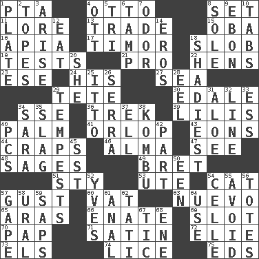 ACROSS 1. Parent Teacher Association (abbr.) 4. "Beetle Bailey" pooch 8. Arrange properly for use 11. Old wives' tales, e.g. 13. Swap 15. Chief or king in Benin or Nigeria 16. Capital of Western Samoa 17. The easternmost of the Lesser Sundas 18. Messy guy 19. Trials 21. Adept person 22. Coop moms 23. Compass dir. 24. Part of HMS, perhaps 27. Ocean 29. False hair 30. Peak District village in England 34. Compass dir. 36. Long journey 39. Ms. Damita and namesakes 40. Inside of hand 41. Fourth or lowest deck 43. Immeasurably long periods of time 44. Dice game 46. _ mater 47. Perceive with the eye 48. Gurus 49. Cy Young winner Saberhagen 51. Filthy place 53. Shoshoni 54. Domesticated feline 57. Abrupt rush of wind 60. Large container 63. New (sp.) 65. Ancient river in northeast Turkey 66. Related on the mother's side 69. Slit 70. Infant food 71. Smooth fabric 72. Writer Wiesel 73. Raised railways 74. Louse (plural) 75. Begley and Asner DOWN 1. Food holder 2. Drinks excessively 3. Get up 4. Baseball player Mel 5. Three (prefix) 6. Pack (down) 7. Aroma 8. Flatfish 9. Inky black, to poets 10. Bar bills 12. Erode 14. Greek god of love 18. Most dark, concealed or hidden 20. A female animal or person 25. "Tell ____ the Marines!" 26. Father Junipero _ 28. Snakelike fish 29. Storms 31. _ vera 32. Actor's bit 33. Curvy letter 34. "Two Mules for Sister ____" 35. Volcanic refuse 37. Pipe bend 38. Dried seaweed eaten as food 40. Personal Computers (abbr.) 42. Component 45. Fast jet (abbr.) 50. Car or cant ending 52. Jacques Cousteau's middle name 54. Cell (Danish) 55. Prevent from happening 56. Hauls 57. Open wide 58. Mountain range 59. Plant excrements 61. Of or related to the anus 62. Jacques of French films 64. Purpose 67. Nervous spasm 68. Compass dir.