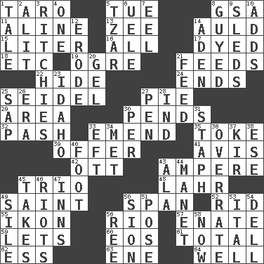 ACROSS 1. Pacific island yam 5. Third day of the wk. 8. Girls' org. (abbr.) 11. Place in a line 13. Last letter of the English alphabet 14. Old (Scot.) 15. 61 cubic inches 16. Everything 17. Colored 18. And so on (abbr.) 19. Legendary monster 21. Eats 22. Flintstone garb 24. Conclusions 25. Beer mug 27. Sliced dessert 29. Length times width 30. Hangs 32. Romantic infatuation 33. Make improvements or corrections to 35. Puff or smoke 39. Auction bid 41. Opinion 42. Baseball player Mel 43. Electrical Unit 45. Musical group of three 48. Cowardly lion portrayer 49. Virtuous person 50. Connect, as a bridge 52. To free from 55. Picture 56. River (Sp.) 57. Related on the mother's side 59. Allows 60. Greek goddess of the dawn 61. "_____ Recall" 62. Double-curved letter 63. Compass dir. 64. Water source DOWN 1. Story 2. Came down and settled, as after flight 3. Actors Guy, Robert Welles, and Clint 4. Single 5. Czar 6. Ubangi River tributary 7. Snakelike fish 8. Secured 9. Bobsleighs 10. Sums up 12. Wear away 14. Arabian gulf 20. Set 21. Nourish 23. Potato state 25. Plant excrement 26. Epoch 27. Writing instrument 28. Working for oneself (abbr.) 30. For each 31. Staphylococcus 33. Lizard (obsolete) 34. Was introduced to 36. Make much ado about nothing 37. Apertif with cassis 38. Compass dir. 40. 12 inches 43. According to 44. French painter Edouard 45. Proceeds 46. Disturbances 47. Restaurants 49. Drop; flow; fall 50. The Jewish people; Israel 51. Airs 53. Slanted text style (abbr.) 54. Small valley 56. To riddle 58. Immediately