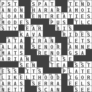 ACROSS 1. Pacific Standard Time (abbr.) 4. Petty quarrel 8. Be inclined (to) 12. At once, immediately (arch.) 14. Ethiopian city, capital of Harari 16. Mine, in Marseilles 17. Grant temporary use of 18. Pleas 20. Methods 22. Suppuration 23. Affectionate concern, for short 24. Filthy place 25. Ewer handle 28. Again 30. Polynesian shrub of the pepper family 31. Amusement-park features 35. "One Day ___ Time" 37. SW Asia republic 40. Allows 41. Actor Alda or Thicke 42. Sir (Sp.) 44. Queen of England 1702-14 45. Floor coverings 46. Former U.S. Attorney General Janet 47. Girls' org. (abbr.) 48. Believer in; advocate of (suffix) 50. Otherwise 52. Elected rep. 54. Afternoon social gathering 55. Fast jet (abbr.) 58. Double-curved letter 61. ___ a Wonderful Life 63. Food holder 65. Probability 70. Composer Stravinsky 71. Caspian sea tributary 72. Spanish missionary in California 73. Snakelike fish 74. Remaining after all deductions 75. Examine hastily 76. Observe DOWN 1. Insides of hands 2. Snout, nose 3. Sycophant 4. A female animal or person 5. Baking dish 6. Nonscientific branch of learning 7. Canvas cover 8. Make lace 9. Send forth 10. Christmas carol 11. Compact _ 13. Compass dir. 15. Reuben's nickname 19. SW Saudi Arabia district 21. Ocean 26. Deliberation 27. More uncommon 29. Fodder prepared in a silo 30. Sunflower state 32. Lairs 33. Inactive volcano in Sicily 34. Compass dir. 35. Having or resembling wings 36. Jacques of French films 38. A saturated hydrocarbon 39. Music written for nine 41. Nursemaid (var.) 43. Hero or heavy, e.g. 49. Famous astronaut Armstrong 51. Plant excrement 53. Nuclear Threat Initiatives 55. Gurus 56. Fur scarf 57. Laconic 58. Style 59. The founder of a family 60. Three-handed card game 62. "______ My Girl" (Turtles hit) 64. Untruth 66. Eastern Standard Time (abbr.) 67. The grampus (Milton) 68. Mouth or opening 69. One of the 12 tribes of Israel