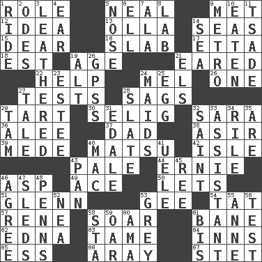 ACROSS 1. Hero or heavy, e.g. 5. Be tempered by heat 9. Was introduced to 12. The main thing one is thinking about 13. Rounded earthenware pot or jar 14. Oceans 15. Letter starter 16. Thick slice 17. Singer James 18. Eastern Standard Time (abbr.) 19. Mature 21. Having ears or earlike features 22. Assist 24. Cartoonist voice _ Blanc 26. Single 27. Trials 28. Sinks 29. Small pie 30. Former Milwaukee Brewers owner Bud 32. "Two Mules for Sister ____" 36. Toward shelter 37. Male parent 38. SW Saudi Arabia district 39. Ancient Persian 40. Taiwanese island in East China Sea 42. Capri or Wright 43. Diluted with white 44. Bert's buddy 46. Viper 49. Adept person 50. Allows 51. American astronaut and politician John 53. Turn to the right 54. Make lace 57. French philosopher Descartes 58. Fly high 61. Object of repulsion 62. Pulitzer Prize-winning author Ferber 63. Docile 64. Lodging establishments 65. Double-curved letter 66. Like ___ of sunshine 67. Proofreading order DOWN 1. Travel on or in a vehicle 2. Lyric poems 3. Resembling or made to resemble leather 4. Hearing organ 5. Characteristic smell of wine 6. Pipe bend 7. Insect wing 8. Experiment locale 9. Paris' subway 10. Eroded 11. Sadhe (variant) 14. Ocean 19. Keyboard modifier key 20. Global Positioning Systems (abbr.) 21. Raised railways 23. First name in cosmetics 24. Women servants 25. Ovum 27. Story 28. Schedule 29. Scottish cap 31. Peak District village in England 32. Inhabitant of Heaven 33. Helper 34. Cause heat under the collar 35. "We ___ not amused" (Victoria) 40. Big _ 41. Ubangi River tributary 43. Baking dish 45. To sift 46. Match 47. Bobsleighs 48. Actor Sean's family 52. Teachers' org. 53. Jennifer or Joel 55. Queen of England 1702-14 56. Trial 58. R.R. building 59. Boat paddle 60. Wet nurse (var.) 61. Twice