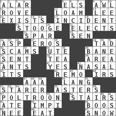 ACROSS 1. Having or resembling wings 5. Raised railways 8. Leather borer 11. Be footloose 12. Rich soil 13. Area sheltered from the wind 14. Has an existence 17. Happening 19. Moe Howard, for one 21. Chooses 22. Coast Guard woman 23. Elected rep. 24. Viper 27. Greek god of love 29. Small boy 32. Fraudulent business schemes 34. Shoshoni 36. Object of repulsion 37. Posted 38. Afternoon social gathering 39. Type of rug 40. Pismires 41. Consenting reply 42. Rhinal 43. ___ a Wonderful Life 44. San ____ (Riviera town) 46. Big collection agency 47. American Automobile Association (abbr.) 50. Austrian-born American filmmaker Fritz 52. A viewer who gazes fixedly 55. Michaelmas daisies 57. Coward 59. Flight of steps 62. Had dinner 63. Body of Kaffir warriors 64. Expressions of contempt or scorn 65. Born 66. Ingest 67. Overwhelm DOWN 1. "We ___ not amused" (Victoria) 2. Brine-cured salmon 3. Opinion 4. Musical pauses 5. Age 6. Shoestrings 7. Grin 8. Actor Baldwin 9. Left 10. Allows 12. Falsehood 15. Drinks excessively 16. Fly high 18. Lair 20. Sulky 24. Slender Brazilian palm 25. Aroma 26. Leg coverings 28. Navigate 29. Tarsus (plural) 30. Approach 31. Allots cards 33. Mountains (abbr.) 35. Artist's stands 36. Sound made by sheep 42. Music written for nine 45. Floor protectors 47. Tate display 48. Nest on high 49. Scent 51. Seizes 52. Connect, as a bridge 53. Carryall 54. Toward shelter 55. Cuckoo 56. The Jewish people; Israel 58. Choose 60. Friend of Pooh 61. Compass dir.