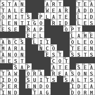 ACROSS 1. Comedian Laurel of Laurel & Hardy 5. Nonscientific branch of learning 8. Beverage made from leaves 11. Lie 12. Erode 14. Increase 15. Leaves out 17. Food holder 18. Flaplike covering 19. Small, flat, pigmented spot on the skin 21. To free from 22. French article 23. Compass dir. 24. Reproach for some lapse or misdeed 25. Choose 27. Snakelike fish 28. Unable to walk 31. Lettered men learn these first 35. Cards in a Roman deck? 37. Butter sub 38. Hindu Mythology: god of death 39. Non-commissioned officer (abbr.) 41. Adolescent 42. At once, immediately (arch.) 43. Eastern Standard Time (abbr.) 45. Fast planes 46. Behest 47. Small bed 49. Plant excrement 51. Had dinner 52. Ocean 55. The 23rd letter of the Hebrew alphabet 57. Mouth or opening 60. Thinks logically 62. Wedding promise 63. Sets of matching outer garments 65. Table seasonings 66. For each 67. Inside; within (prefix) 68. The content of cognition 69. Working for oneself (abbr.) 70. Label 71. Dormintory (informal) DOWN 1. Took without asking 2. Makes less strong or intense 3. Place in a line 4. Remaining after all deductions 5. Leather borer 6. Stern 7. Jacques of French films 8. Baron Munchausen's specialties 9. Singer Brickell 10. Sums up 13. Do over again 16. Beget 17. Cotton for raincoats, e.g. 20. Highlander 26. Graphs 29. Rendezvous 30. Immeasurably long periods of time 31. Nursemaid 32. Object of repulsion 33. What you're doing now 34. Before Barbara or Clara 36. Frozen water 40. Motion picture awards 44. Haul 48. Afternoon social gatherings 50. Introduce or present, as a question 52. Twentieth part of a lira 53. Keyboard key 54. Indian state 55. Native american tent (variation) 56. An important port of Yemen 58. The smallest animal of a litter 59. Opera by Verdi 61. Expressed in words 64. Coat; cloak