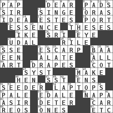 ACROSS 1. Infant food 4. Letter starter 8. Groovy apts. 12. Title for a knight 13. Burn superficially 14. Mouths or openings 15. It may be bright or harebrained 17. _____ Park, CO 18. Sweet dark-red dessert wine 19. Core 21. College papers 23. Mamie's mate 24. Indian title of respect (Mr.) 26. Sight organ 27. Hereditary estate 28. Cause heat under the collar 30. Compass dir. 31. Fortification 34. Sound made by sheep 37. Car or cant ending 38. Having winglike extensions 39. Everything 40. Tate display 41. Window treatments 42. Small bed 43. System (abbr.) 44. Create 46. Layer 47. Fast jet (abbr.) 50. Followers of ems 51. Sowing specialist 54. Portable computers 57. Diluted with white 58. Peak District village in England 60. California wine valley 62. SW Saudi Arabia district 63. Prevent from occurring 64. 4-wheeled motor vehicle 65. Vintage cars 66. Washington bills 67. And so on (abbr.) DOWN 1. Air pressure measure (abbr.) 2. Helper 3. Elected leader of a country 4. Flat circles 5. Keyboard key 6. Mature 7. Relief 8. Wimpy's pal 9. Came up 10. Have the gumption 11. Fast planes 13. Elected rep. 16. "____ silly question..." 20. Snakelike fish 22. Assist 25. Feeling or showing extreme anger 27. One who makes use of a thing 29. Angers 30. Ocean 31. Hearing organs 32. Narrow boards 33. Head covering 34. Keyboard key 35. Medicinal plant 36. The first octave above the treble staff 41. Unit of force 43. Spring feasts 44. Was introduced to 45. Soon (poet.) 46. Sun: prefix 48. Chalkboard 49. Falsehoods 51. Practice fight 52. Relaxation 53. Make new 55. For each 56. Petty quarrel 59. Lair 61. Curve