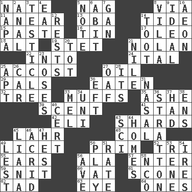 ACROSS 1. Nathan's nickname 5. Tired old horse 8. By way of 11. Approach 13. Chief or king in Benin or Nigeria 14. Event that recurs at intervals 15. Thick mixture 16. Shallow baking pan 17. Butter sub 18. Keyboard modifier key 19. Proofreading order 21. Pitcher Ryan 22. To the inside or interior of 24. Slanted text style (abbr.) 25. Buttonhole 27. Lubricate 29. Friends 30. Consumed 32. Family _ (genealogy) 33. Bungles 35. American tennis player Robert 39. Aroma 41. Comedian Laurel of Laurel & Hardy 42. Connecticut Ivy Leaguer 43. Broken pieces 45. Cowardly lion portrayer 48. Root beer relative 49. It is permitted: Lat. 50. Demure 52. Three (prefix) 55. Hearing organs 56. Insect wing 57. Keyboard key 59. In a ____ (agitated or irritated) 60. Large container 61. Biscuitlike quick bread 62. Bit 63. Sight organ 64. Singles DOWN 1. California wine valley 2. Of or related to the anus 3. A testis 4. Ingest 5. Short letter 6. "This won't hurt ____!" 7. Separate the seeds from cotton 8. Country residence 9. Perfect 10. Age 12. Musical pauses 14. A blast of a horn 20. Small child 21. "Death on the ____" 23. Olfactory organs 25. Fitting 26. Auto 27. Clumsy lout 28. It is 30. Newt 31. Rhinal 33. Cartoonist voice _ Blanc 34. Corn or form start 36. Ski resort town in Vermont 37. Possessed 38. Followers of ems 40. An absolute certainty 43. _-fi 44. Dwellings 45. Climbing, woody, usually tropical vines 46. Sour-tasting 47. Command 49. For fear that 50. Romp 51. Pace 53. French philosopher Descartes 54. Angers 56. "___ Maria" 58. Non-commissioned officer (abbr.)