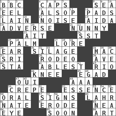 ACROSS 1. English channel? 4. Balmoral and tarboosh 8. Ocean 11. Snakelike fish 12. Columnist Joseph or Stewart 14. Writing tablets 15. (Had) reclined 17. Annoying sound 18. Opera by Verdi 19. Contrary to your interests or welfare 21. Pet term 23. Small island 24. Fast jet (abbr.) 25. Inside of hand 27. Old wives' tales, e.g. 30. Hearing organ 31. Fodder prepared in a silo 34. Apple computer (short form) 37. Indian title of respect (Mr.) 38. Cowboy competition 39. "___ Maria" 40. R.R. building 41. Most capable 43. River (Sp.) 44. Leg joint 45. Mild oath 47. Fr. "Yes" 49. American Automobile Association (abbr.) 50. Streamer paper 52. Substance 56. Spoken 57. Omens 60. Cowardly lion portrayer 61. Nathan's nickname 62. Wear away 63. Teachers' org. 64. Sight organ 65. Within a short period 66. Tate display DOWN 1. Actor Lugosi 2. Necklace unit 3. 154 in Roman numerals 4. 2nd pers. sing. pres. of can (arch.) 5. _ vera 6. Air pressure measure (abbr.) 7. Mayday 8. Virtuous person 9. Whirlpool 10. White ___ sheet 13. Animal enclosure 14. Zero-star reviews 16. Actress Patricia 20. Basketball hoops 22. Purpose 25. Role in a play 26. Roberta Peters solo 27. Dipping utensil 28. Double curve, resembling the letter S 29. Vintage cars 30. Double-curved letter 32. SW Asia republic 33. Ear part 34. Hindu Mythology: god of death 35. Enthusiastic 36. Corporate head (abbr.) 42. Beverages made from leaves 44. Monetary unit of Laos 46. Highlander 47. Declaim 48. Ubangi River tributary 49. NE Netherlands city 50. Supercomputer manufacturer 51. Compass dir. 52. Inside; within (prefix) 53. Grandmother 54. "Mermaids" star 55. Part of Q.E.F. 56. Single 58. Big collection agency 59. Thick or sticky substance