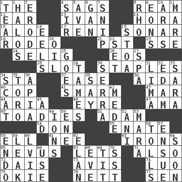 ACROSS 1. Definite Article 4. Settles 8. 480, 500 or 516 sheets of paper 12. Hearing organ 13. "Terrible" tsar 14. Israeli folk dance 15. _ vera 17. Painter Guido (1575-1642) 18. Underwater navigation system 19. Cowboy competition 21. Pacific Standard Time (abbr.) 23. Compass dir. 24. Former Milwaukee Brewers owner Bud 26. Greek goddess of the dawn 28. Narrow, elongated depression 30. Paper fasteners 34. R.R. building 37. Comfort 39. Opera by Verdi 40. Police officer (slang) 41. Excessive but superficial compliments 43. Spoil 44. Operatic vocal solo 46. Jane of fiction 47. Nanny (var.) 48. Sycophants 51. First of billions? 54. Spanish title 55. Maternal 58. Pipe bend 61. Born 63. Metal shackles 65. Congenital growth or mark on the skin 67. Allows 71. In addition 72. Raised platform 73. Deliberation 74. Nilotic language 75. Migrant worker of the '30s 76. Remaining after all deductions 77. Elected rep. DOWN 1. Pull into pieces 2. Rings 3. Wear away 4. Title for a knight 5. "___ Maria" 6. Separate the seeds from cotton 7. Clip 8. 17th letter of the Greek alphabet 9. Immeasurably long periods of time 10. Ancient river in northeast Turkey 11. Female horse 16. Snakelike fish 18. Portico 20. Lubricate 22. Arrange properly for use 25. Moves 27. Health resort 29. Softens 30. Spanish missionary in California 31. Pale green bean 32. Dutch treat 33. "Two Mules for Sister ____" 34. Scram! 35. "Corrida" creature 36. Capital of Western Samoa 38. Declare 42. Ancient Persian 45. Say or write further 49. Charged atoms 50. Compass dir. 52. Cuckoo 53. Hindu Mythology: god of death 56. For Whom the Bell _____ 57. Follow as a consequence or result 58. Inside; within (prefix) 59. Path through which fluid escapes 60. 57 in ancient Rome 62. Enthusiasm 64. Within a short period 66. Purpose 68. Night before a holiday 69. Teat (slang) 70. Fast jet (abbr.)