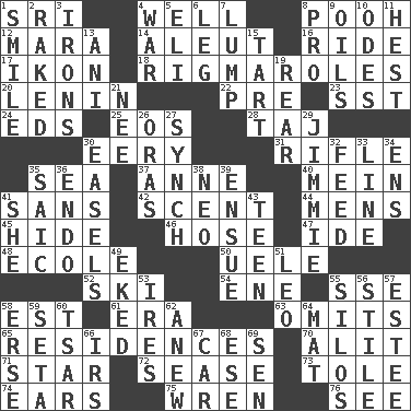 ACROSS 1. _ Lanka 4. Water source 8. "Silly old bear" 12. Hindu Mythology: god of death 14. Eskimo relative 16. Travel on an animal 17. Picture 18. Complicated, petty procedures 20. Soviet premier 1918-24 22. Before (prefix) 23. Fast jet (abbr.) 24. Begley and Asner 25. Greek goddess of the dawn 28. _ Mahal 30. Suggestive of the supernatural 31. Ransack; plunder; pillage 35. Ocean 37. Singer Murray 40. Count _ (2 wds.) 41. Without 42. Aroma 44. Not women's 45. Flintstone garb 46. Stockings 47. Binary compound 48. Learning spot: Fr. 50. Ubangi River tributary 52. What Jean-Claude Killy likes to do 54. Compass dir. 55. Compass dir. 58. Eastern Standard Time (abbr.) 61. Period 63. Leaves out 65. Homes 70. Set down 71. Play the lead 72. Gospel singer Marvin 73. Lacquered or enameled metalware 74. Hearing organs 75. Songbird 76. Perceive with the eye DOWN 1. Grin 2. Swept the length of 3. Removes the wrinkles 4. Armed conflict 5. Biblical high priest 6. Part of a journey 7. Mass 8. Adept person 9. Lubricates 10. Lyric poems 11. Command 13. Cuckoo 15. Small pie 19. Rump 21. Born 26. Mouths or openings 27. Synchronize (abbr.) 29. Stevie Ray Vaughan's brother 30. Artist's stands 32. Nourish 33. Actor's bit 34. Followers of ems 35. Ketch in the Levant 36. Inside; within (prefix) 38. Modern: prefix 39. Follow as a consequence or result 41. A female animal or person 43. Adolescent 49. Made supply last 51. Lion 53. Angers 55. Grain storage towers 56. Vertical member of a panel or frame 57. First name in cosmetics 58. Celtic language 59. Stalk of a moss capsule 60. Russian ruler of old 62. Afresh 64. Floor protector 66. Big collection agency 67. Auto 68. Compass dir. 69. Elected rep.