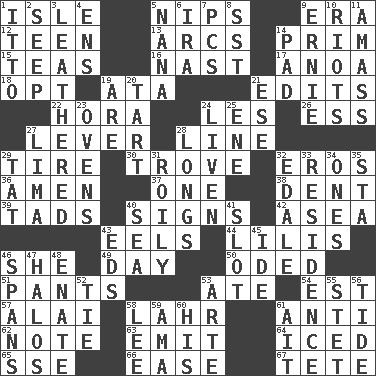 ACROSS 1. Small island 5. Pinches, bites 9. Period 12. Adolescent 13. Curves 14. Demure 15. Afternoon social gatherings 16. Political cartoonist Thomas 17. Small Philippine buffalo 18. Choose 19. _ moment's notice (2 wds.) 21. Prepares for publication 22. Israeli folk dance 24. French article 26. Curvy letter 27. Prying instrument 28. Actor's bit 29. Hoop that covers a wheel 30. Collection of objects 32. Greek god of love 36. So be it 37. Single 38. Gouge 39. Small boys 40. Omens 42. At sea 43. Snakelike fish 44. Ms. Damita and namesakes 46. A female animal or person 49. 24 hours 50. Wrote a lyric poem 51. Leg coverings 53. Had dinner 54. Eastern Standard Time (abbr.) 57. Mountain range southwest of Kyrgyzstan 58. Cowardly lion portrayer 61. Opposed to 62. Musical sound 63. Send forth 64. On the rocks 65. Compass dir. 66. Comfort 67. False hair DOWN 1. "Tell ____ the Marines!" 2. Ooze 3. Resembling or made to resemble leather 4. Followers of ems 5. Grandmother 6. Lyricist Gershwin 7. Personal Computers (abbr.) 8. Fast jet (abbr.) 9. Bert's buddy 10. Debaucheries 11. Collect or gather 14. Groovy apt. 19. "We ___ not amused" (Victoria) 20. Small pie 21. Compass dir. 23. Baking chambers 24. Make or become more lively 25. Compass dir. 27. Pale green bean 28. Yearns 29. Make lace 31. Turbulent 32. Peak District village in England 33. Dwelling 34. Singles 35. R.R. building 40. Ocean 41. Slit 43. Begley and Asner 45. Binary compound 46. Connects, as a bridge 47. Rings 48. Related on the mother's side 52. Neckwear 53. Johnson of "Laugh-In" 55. Proofreading order 56. Event that recurs at intervals 58. Area sheltered from the wind 59. Nanny (var.) 60. Part of HMS, perhaps 61. Small island