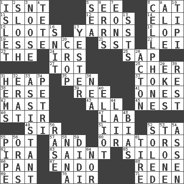 ACROSS 1. Is not 5. Perceive with the eye 8. Domesticated feline 11. _ gin 12. Greek god of love 14. Biblical high priest 15. Plunders 17. Tall tales 18. Chop off 19. Core 21. Fast jet (abbr.) 22. Luau accessory 23. Definite Article 24. Big collection agency 25. Plant excrement 27. Small child 28. "Mermaids" star 31. Pile 35. Fenced enclosure 37. Puff or smoke 38. Celtic language 39. Portuguese money of account (variant) 41. Singles 42. Vertical spar for supporting sails 43. Everything 45. Egg locale 46. Tumult 47. Experiment locale 49. Title for a knight 51. One more than two 52. R.R. building 55. Cooking vessel 57. Added to 60. Speakers 62. Lyricist Gershwin 63. Inhabitant of Heaven 65. Grain storage towers 66. Baking dish 67. Inside; within (prefix) 68. French philosopher Descartes 69. Eastern Standard Time (abbr.) 70. Atmosphere 71. Genesis locale DOWN 1. Small island 2. Agitate, as a liquid 3. Trap for birds or small mammals 4. Wig 5. Ocean 6. Blunders 7. Immeasurably long periods of time 8. Portable communications device 9. Medicinal plant 10. Native american tent (variation) 13. Fast planes 16. In a ____ (agitated or irritated) 17. Last 20. Riding implement 26. NE Massachussets city 29. Makes supply last 30. Remainder 31. Equivocates 32. Part of Q.E.F. 33. Helper 34. _ dish (used to culture cells) 36. Teachers' org. 40. American author Paul (1891-1958) 44. Den 48. Prejudice 50. To erase 52. Having a sole or soles 53. Heavy duty weighing machine 54. NE Netherlands city 55. Corncob 56. Mouths or openings 58. Grandmother 59. "You Light Up My Life" star Conn 61. Hoop that covers a wheel 64. Not either