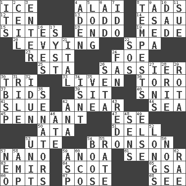 ACROSS 1. Frozen water 4. Jai _ 8. Bits 12. "___ Little Indians" 13. Texas town _ City 14. Son of Isaac 15. Settings 18. Inside; within (prefix) 19. Ancient Persian 20. Imposing or collecting, as a tax 22. Health resort 23. Take ten 24. Enemy 25. R.R. building 26. More impudent 30. Three (prefix) 33. Make or become more lively 36. "Corrida" creature 37. Auction offers 39. Be seated 40. In a ____ (agitated or irritated) 41. Turn sharply 42. Approach 44. Ocean 45. Pre-World Series prize 47. Compass dir. 50. _ moment's notice (2 wds.) 51. Small valley 53. Shoshoni 54. "Death Wish" actor 57. Billionth: prefix 59. Small Philippine buffalo 61. Sir (Sp.) 63. Arab leader 64. Native of Scotland 65. Girls' org. (abbr.) 66. Chooses 67. Introduce or present, as a question 68. Observe DOWN 1. ___ a Wonderful Life 2. To provide with a ceiling 3. Keyboard key 4. An important port of Yemen 5. Protracted 6. Say or write further 7. Wedding promise 8. Storms 9. At sea 10. Male parent 11. Institute legal proceedings 16. Nights before holidays 17. System (abbr.) 21. Slanted text style (abbr.) 22. Mayday 24. Air blower 26. Stalk of a moss capsule 27. Charged particles 28. 4th largest of the Great Lakes 29. Roll call or roster of names 30. Cook's measure (abbr.) 31. Cause heat under the collar 32. Goddess of spring and wife of Bragi 34. Is not 35. Compete 38. Legislators 42. Santa ___, CA 43. Redecorate 46. Had dinner 48. Elected reps. 49. Otherwise 52. Yearns 53. A single undivided whole 54. Expressions of contempt or scorn 55. Pace 56. Sense of smell 57. Modern: prefix 58. Electrical Unit 59. Cleo's killer 60. Non-commissioned officer (abbr.) 62. Actress Charlotte