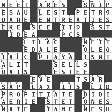 ACROSS 1. Confront 5. Ancient Greek god of war 9. Sever or remove by pinching or nipping 13. He sold his birthright 14. For fear that 15. Stone: prefix 16. Have the gumption 17. Pleas 19. Supplement with great effort 20. Observe 21. It would 22. Fast jet (abbr.) 23. The main thing one is thinking about 25. Personal Computers (abbr.) 26. Pale purple color 30. Remaining after all deductions 34. Peak District village in England 35. Margarine 36. Baby powder 39. Beach, in Buenos Aires 42. Is not 43. Came down and settled, as after flight 44. Makes a sale 46. Raised platform 47. First name in cosmetics 48. Night before a holiday 51. Russian ruler of old 54. Plant excrement 57. Not strict 58. ___ a Wonderful Life 60. Flaplike covering 62. Appease 65. "You Light Up My Life" star Conn 66. Nest on high 67. Proofreading order 68. Washington bills 69. Nathan's nickname 70. Docile 71. Soft DOWN 1. Ancient Persian 2. 1973 Nobel Price Winner (Physics) Leo 3. Having ears or earlike features 4. Third day of the wk. 5. Toward shelter 6. French philosopher Descartes 7. Eastern Standard Time (abbr.) 8. Remove all contents or possession from 9. Arrange properly for use 10. Nuclear Threat Initiatives 11. Angers 12. Mail 15. Groovy apts. 18. And so on (abbr.) 20. Expressed in words 24. Chooses 27. Infant locale 28. Everything 29. Desist 30. Annoying sounds 31. Raised railways 32. Nine, plus one 33. Small child 36. Small amount or degree 37. Insect wing 38. Cards in a Roman deck? 40. Consenting reply 41. Keyboard modifier key 45. Allows 48. Writer Wiesel 49. Large container 50. Be extant 52. Place in a line 53. Amusement-park features 54. Connect, as a bridge 55. Type of rug 56. Sweet dark-red dessert wine 58. A distinct part 59. Wig 61. Food container 63. Sliced dessert 64. "One Day ___ Time" 65. Spanish title