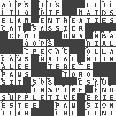 ACROSS 1. High mountains 5. ___ a Wonderful Life 8. Writer Wiesel 12. _ and Stitch 13. Expire 14. Unmarried girls 15. Enthusiasm 16. Pleas 19. Domesticated feline 20. More impudent 21. Penny 23. Heredity factor (abbr.) 24. Basketball assoc. 27. I made a mistake 30. Monetary unit of Yemen 31. Medicinal drug used to evoke vomiting 34. Spanish pot 35. Crow sounds 38. Relating to or accompanying birth 40. Chow _ 41. Toward shelter 42. Cigar-shaped 44. Baking dishes 45. "Corrida" creature 46. Be seated 47. Distress signal 50. Son of Isaac 53. Heighten or intensify 57. Conclude 59. Supplying deficiencies 63. 4th largest of the Great Lakes 64. First name in cosmetics 65. Baking dish 66. The Jewish people; Israel 67. Pull apart 68. Compass dir. 69. Portable shelter DOWN 1. Actor Baldwin 2. Pale purple color 3. Food holder 4. Boy, to dad 5. The content of cognition 6. Canisters 7. Arranges properly for use 8. Consume 9. Cards in a Roman deck? 10. Binary compound 11. Double-curved letter 14. Hindu Mythology: god of death 17. To free from 18. Car or cant ending 20. Constrict 22. Annoying sounds 24. The longest river in the world 25. Indonesian resort city 26. Actor Alda or Thicke 28. Writing instrument 29. Jazz singing style 30. Lover boys 32. Had dinner 33. Haul 35. Smile enhancers 36. Jai _ 37. Left 39. Lion 43. Woody plant 47. Filth; sediment 48. Single 49. Fast jet (abbr.) 51. Nest on high 52. The state of being joined or united 54. Corncob 55. "Terrible" tsar 56. French philosopher Descartes 58. Incision 59. Put into a specified state 60. Purpose 61. Parent Teacher Assoc. 62. For each 63. Eastern Standard Time (abbr.)