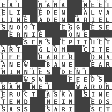 ACROSS 1. Ingest 4. Nanny 8. Confront 12. Biblical high priest 13. Paradise 14. Inventor's middle name 15. Welles in "The Third Man" 17. Arabian gulf 18. Satellite of Uranus 19. Snout, nose 21. Oval reproductive body of a fowl 23. Compass dir. 24. Bert's buddy 26. Single 28. Elected reps. 30. Curse 34. Tate display 37. Seize upon or latch onto something 39. Quote 40. Area sheltered from the wind 41. More uncommon 43. Heredity factor (abbr.) 44. Afresh 46. Object of repulsion 47. Ewer handle 48. Fools 51. Scratch 54. Compass dir. 55. Gives food to 58. Prohibit 61. Fish or hair follower 63. Make _____ (do battle with) 65. Spew [out] 67. "____ silly question..." 71. Trig term 72. Look after 73. Chow _ 74. Begley and Asner 75. Backtalk 76. Indian skirt 77. Put into a specified state DOWN 1. Snakelike fish 2. Place in a line 3. The easternmost of the Lesser Sundas 4. Teachers' org. 5. Say or write further 6. Born 7. Queen of England 1702-14 8. Make imperfect 9. Writer Wiesel 10. Nights before holidays 11. Story 16. Immeasurably long periods of time 18. Hindu god of fire 20. Make a knot 22. Republican Party 25. Engineer (abbr.) 27. And so on (abbr.) 29. Broad, flat, thick pieces 30. Make improvements or corrections to 31. Flintstone garb 32. Inactive volcano in Sicily 33. Separate forcefully 34. ____ Jay Lerner 35. Painter Guido (1575-1642) 36. Adolescent 38. Mouth or opening 42. Coral collection 45. Compass dir. 49. Is not 50. She-sheep 52. ___ Haven, CT 53. Beverages made from leaves 56. Frees from moisture 57. Message 58. Stakes 59. Type of rug 60. Religious women 62. Scottish caps 64. A home for chicks 66. Music discs 68. Ocean 69. Apertif with cassis 70. Cuckoo