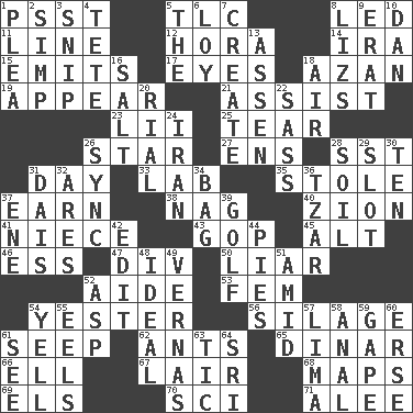 ACROSS 1. Inconspicuous attention getter 5. Affectionate concern, for short 8. Directed 11. Actor's bit 12. Israeli folk dance 14. Retirement account (abbr.) 15. Sends forth 17. Sight organs 18. Muslim summons to prayer 19. Seem 21. Aid 23. Cards in a Roman deck? 25. Lacerate 26. Play the lead 27. Followers of ems 28. Fast jet (abbr.) 31. 24 hours 33. Experiment locale 35. Fur scarf 37. Merit 38. Tired old horse 40. The Jewish people; Israel 41. Sibling's daughter 43. Republican Party 45. The first octave above the treble staff 46. Curvy letter 47. HTML Container Element 50. One who doesn't tell the truth 52. Helper 53. Opposite of masc. 54. Next before 56. Fodder prepared in a silo 61. Ooze 62. Pismires 65. Middle Eastern gold or silver currency 66. Pipe bend 67. Den 68. Atlas contents 69. Raised railways 70. _-fi 71. Toward shelter DOWN 1. Entreaty 2. Simple or foolish person 3. Sever or remove by pinching or nipping 4. False hair 5. Definite Article 6. Myrna of the movies 7. Cause to be 8. Belonging to Elizabeth 9. Part of Q.E.F. 10. One of the 12 tribes of Israel 13. NE Netherlands city 16. Table seasoning 18. Atmosphere 20. Monetary unit of Yemen 22. Backtalk 24. SW Asia republic 26. Synchronize (abbr.) 28. The visible part of the earth's surface 29. Narrow, elongated depression 30. "___ Little Indians" 31. Raised platform 32. Ancient Greek god of war 34. Container for groceries 36. Czar 37. Compass dir. 39. Eighteen holes 42. Prepare for publication 44. Sliced desserts 48. Standard of perfection 49. Actresses Bloom and Felton 51. Among 52. Cleo's killer 54. Shout 55. Snakelike fish 57. Pale green bean 58. Of or related to the anus 59. Open wide 60. Celtic language 61. Perceive with the eye 63. Nervous spasm 64. Indian title of respect (Mr.)
