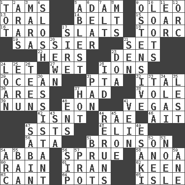 ACROSS 1. Scottish caps 5. First of billions? 9. Margarine 13. Relating to the mouth 14. Waist strap 15. Fly high 16. Pacific island yam 17. Narrow boards 18. Torque (variant) 19. More lively and spirited 21. Arrange properly for use 22. Possessive pronoun 23. Cub Scout units 24. Allow 27. Soggy 28. Charged atoms 29. Sea 31. Parent Teacher Assoc. 32. Slanted text style (abbr.) 36. Ancient Greek god of war 37. Possessed 38. Grand slam 39. Religious women 40. Age 41. Viva Las _ 42. Is not 44. Actress Charlotte 46. Small island 47. Fast planes 48. Writer Wiesel 50. "One Day ___ Time" 51. "Death Wish" actor 54. Swedish rock group 56. Upset 58. Small Philippine buffalo 60. Water falling in drops from the sky 61. SW Asia republic 62. Peachy ____! 63. Patter 64. Cooking vessels 65. Capri or Wright DOWN 1. Small child 2. Caspian sea tributary 3. Hindu Mythology: god of death 4. Make a splashing sound 5. Most capable 6. Letter starter 7. The first octave above the treble staff 8. Mountains (abbr.) 9. Clearly or manifestly demonstrative 10. Plunders 11. Ewer handle 12. The grampus (Milton) 17. Beget 20. Stitched 21. Elected rep. 23. ___ good deed 24. Grant temporary use of 25. Shade of tan 26. Adolescent 28. It would 30. Helper 31. Baking dish 33. Ancient Roman robe 34. Jai _ 35. For fear that 37. Being at a high temperature 40. Followers of ems 41. Distinctive style or manner 43. R.R. building 44. Summer TV shows 45. Medicinal plant 47. Unit of acoustic absorption 49. 1973 Nobel Price Winner (Physics) Leo 51. Naughty child 52. Washington bills 53. Christmas carol 54. Curve 55. Sound made by sheep 56. Small drink 57. Adept person 59. A saturated hydrocarbon