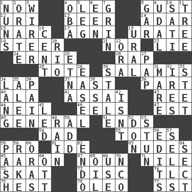 ACROSS 1. At this time 4. Cassini of fashion 8. Abrupt rush of wind 12. RI univ. 13. Fermented drink made from hops 14. The sixth month of the Jewish calendar 15. Drug cop 17. Hindu god of fire 18. A salt of uric acid 19. Navigate 21. Not either 23. Whopper 24. Bert's buddy 26. Hit sharply and swiftly 28. Carry 30. Deli grouping 34. Pet locale 37. Political cartoonist Thomas 39. Piece 40. In the manner of 41. Slender Brazilian palm 43. To riddle 44. Famous astronaut Armstrong 46. Snakelike fish 47. Eastern Standard Time (abbr.) 48. Commissioned military rank 51. Extremities 54. Male parent 55. Lugs 58. Adept person 61. Binary compound 63. Unclothed pictures 65. Composer Copland 67. Part of speech 71. The longest river in the world 72. Three-handed card game 73. Plate 74. Affectionate concern, for short 75. Command 76. Butter sub 77. Fast jet (abbr.) DOWN 1. Religious women 2. Declaim 3. One who wires 4. Chief or king in Benin or Nigeria 5. Part of a journey 6. Car or cant ending 7. Smile widely 8. Slender fish 9. Hereditary estate 10. Suttee (variant) 11. Family _ (genealogy) 16. Penny 18. Mountain range 20. _ de Janeiro 22. Mouth or opening 25. Inactive volcano in Sicily 27. Infant food 29. Artist's stand 30. Showing deterioration from age 31. Female horse 32. Angers 33. Proofreading order 34. Long (Scottish) 35. Toward shelter 36. Ache 38. Compass dir. 42. Is not 45. Directed 49. Water falling in drops from the sky 50. Find the sum of 52. Spanish title 53. Astound 56. Proofreads 57. Exchanges for money 58. Romantic infatuation 59. Immoral or dissolute person 60. Mouths or openings 62. Inside; within (prefix) 64. Religious group 66. Baseball player Mel 68. Lubricate 69. Purpose 70. Non-commissioned officer (abbr.)