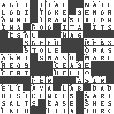 ACROSS 1. Collude with 5. Slanted text style (abbr.) 9. Nathan's nickname 13. Farming town in central California 14. Puff or smoke 15. Sir (Sp.) 16. Queen of England 1702-14 17. Interpreter 19. _ tizzy (2 wds.) 20. Friend of Pooh 21. Call ___ day 22. It is 23. Son of Isaac 25. Tired old horse 26. Scornful expression 30. Confederate soldiers (slang) 34. Took without asking 35. Mouths or openings 36. Hindu god of fire 39. Box-office sellout 42. Female horse 43. Vintage cars 44. Desist 46. Foregone conclusion 47. Phone greeting 48. For each 51. SW Saudi Arabia district 54. Connecticut Ivy Leaguer 57. Actress Gardner 58. Experiment locale 60. Male parent 62. Homes 65. Indian skirt 66. Table seasonings 67. Comfort 68. "______ My Girl" (Turtles hit) 69. Supplemented with great effort 70. Singer James 71. Torque (variant) DOWN 1. Jai ____ 2. Maid-servant 3. Ferber et al. 4. Make a knot 5. "Tell ____ the Marines!" 6. "Corrida" creature 7. Alias (abbr.) 8. Soviet premier 1918-24 9. Teachers' org. 10. Opposed to 11. A blast of a horn 12. Blunders 15. Volcanic refuse 18. R.R. building 20. The smallest animal of a litter 24. Aid 27. Greek goddess of the dawn 28. Shade tree 29. Arrive at 30. Lover boys 31. Epoch 32. Oblong piece of solid material 33. Compass dir. 36. Curve 37. Unit of force equal to gravity 38. And not 40. Observe 41. Actor Linden 45. Thick slice 48. Writing tablets 49. Night before a holiday 50. The wife of a rajah (variant) 52. Potato state 53. More valued for its uncommonness 54. Celtic language 55. Path through which fluid escapes 56. Capri or Wright 58. For fear that 59. Toward the sea 61. Compact _ 63. It would 64. Domesticated feline 65. Fast jet (abbr.)