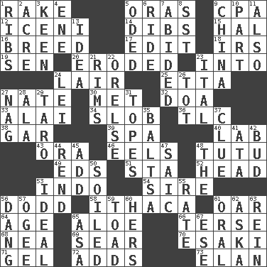 ACROSS 1. Libertine 5. Mouths or openings 9. Tax preparer (abbr.) 12. Ancient Celtic tribe of eastern Britain 14. Claim 15. Actor Linden 16. A special lineage 17. Prepare for publication 18. Big collection agency 19. Elected rep. 20. Worn away 23. To the inside or interior of 24. Den 25. Singer James 27. Nathan's nickname 30. Was introduced to 32. ___ good deed 33. Jai _ 34. Oscar Madison type 36. Affectionate concern, for short 38. Slender fish 39. Health resort 40. Experiment locale 43. Mouth or opening 46. Snakelike fish 48. Ballerina skirt 49. Begley and Asner 51. R.R. building 52. Froth on beer 53. _ china 54. Father 56. Texas town _ City 58. New York city 61. Rowing implement 64. Mature 65. Medicinal plant 66. Laconic 68. Teachers' org. 69. Burn superficially 70. 1973 Nobel Price Winner (Physics) Leo 71. Set 72. Does sums 73. Style DOWN 1. Teases 2. 1/640 square mile 3. Peachy ____! 4. Compass dir. 5. Wrote a lyric poem 6. Travel on an animal 7. Tolerated 8. Fast jet (abbr.) 9. Large country 10. Component 11. In addition 13. It may be bright or harebrained 21. Basketball hoops 22. Threatening words 23. Slanted text style (abbr.) 24. Flowery wreath 26. Small child 27. Tired old horse 28. Wing 29. Pacific island yam 31. Drinks excessively 35. Greek mezzo-soprano Agnes 37. A slight indication 41. "One Day ___ Time" 42. Partially opened flower 44. Tear apart 45. Find the sum of 47. Ketch in the Levant 48. Definite Article 50. Dirtied 53. Perfect 55. Assign a rank or rating to 56. Mild oath, euphamism for damn 57. Double curve, resembling the letter S 59. Frog relative 60. Possessive pronoun 61. Spoken 62. "____ silly question..." 63. It's straight from the horse's mouth 65. White ___ sheet 67. Compass dir.