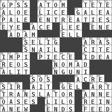 ACROSS 1. Global Positioning Systems (abbr.) 5. Smallest unit of an element 9. Wig 13. _ vera 14. Louse (plural) 15. An organ shaped like a helmet 16. Light colored 17. Pleas 19. Sight organ 20. Adept person 21. Area sheltered from the wind 22. Compass dir. 23. First man 25. Pipe bend 26. Major League Baseball Commissioner Bud 30. Caspian sea tributary 34. Slow-paced one 35. Quote 36. Body of Kaffir warriors 39. Component 42. The main thing one is thinking about 43. Vintage cars 44. Roamer 46. Came down and settled, as after flight 47. Group of southern Bantu languages 48. Mayday 51. 43,560 square feet 54. Title for a knight 57. Small island 58. Set 60. Nonscientific branch of learning 62. Interpreter 65. Queen of England 1702-14 66. Fertile tracts in a desert 67. _ and Stitch 68. It's straight from the horse's mouth 69. Afresh 70. Extremities 71. Nourish DOWN 1. Yawn 2. Beach, in Buenos Aires 3. Having a sole or soles 4. Observe 5. Actor Baldwin 6. Prong on a fork 7. Sep. follower 8. Haggard of country music 9. Make lace 10. Writer Wiesel 11. Adolescent 12. Comfort 15. Highlander 18. Snakelike fish 20. So be it 24. Aid 27. Infant locale 28. One more than two 29. American astronaut and politician John 30. Being or containing an acid 31. To free from 32. Had dinner 33. Ocean 36. Retirement account (abbr.) 37. Cartoonist voice _ Blanc 38. Luau course 40. Gear tooth 41. Australian flightless bird 45. Of or related to the anus 48. Backtalk 49. Lubricate 50. Having lost freshness 52. The wife of a rajah (variant) 53. Bert's buddy 54. Portico 55. SW Asia republic 56. To erase 58. Gilded 59. Greek god of love 61. Be inclined (to) 63. ___ Haven, CT 64. Metal container 65. Sandy's bark