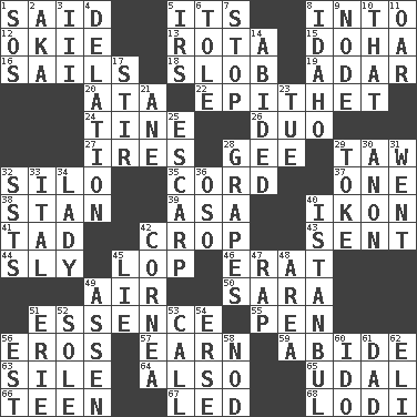 ACROSS 1. Stated 5. ___ a Wonderful Life 8. To the inside or interior of 12. Migrant worker of the '30s 13. Round or rotation of duties 15. Capital of the state of Qatar 16. Moves on water 18. Oscar Madison type 19. The sixth month of the Jewish calendar 20. "One Day ___ Time" 22. Curse 24. Prong on a fork 26. Superhero pair 27. Angers 28. Turn to the right 29. The 23rd letter of the Hebrew alphabet 32. Grain storage tower 35. Drawstring 37. Single 38. Comedian Laurel of Laurel & Hardy 39. White ___ sheet 40. Visual representation of an object 41. Small boy 42. Riding implement 43. Transmitted 44. Mischievous 45. Chop off 46. Part of Q.E.F. 49. Wind 50. "Two Mules for Sister ____" 51. Gist 55. Writing instrument 56. Greek god of love 57. Merit 59. Stay 63. Filth; sediment 64. In addition 65. Hereditary estate 66. Adolescent 67. Directed 68. Farming town in central California DOWN 1. Mayday 2. Alias (abbr.) 3. One more than two 4. Conveyance 5. Big collection agency 6. Lacquered or enameled metalware 7. Cease 8. Potato state 9. Connecting point 10. Not this but _ 11. Boat paddle 14. Tolerated 17. Agitate 21. One (Scot) 23. Third day of the wk. 25. Fortification 28. Wine fruits 29. Casino tip 30. Soon (poet.) 31. Gone 32. Fast planes 33. Slanted text style (abbr.) 34. Kenny Rogers chart-topper in '80 36. Bear (Spanish) 40. Byzantium, centuries later 42. Pupil covering 45. Whopper 47. Hit sharply and swiftly 48. Type of rug 49. NE Netherlands city 51. One of the Great Lakes 52. Flatfish 53. Give a ring to 54. Celtic language 56. Eastern Standard Time (abbr.) 58. Dreamland 60. Wedding promise 61. June honoree 62. Biblical high priest