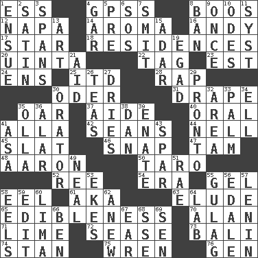 ACROSS 1. Curvy letter 4. Global Positioning Systems (abbr.) 8. Scornful sounds 12. California wine valley 14. Odor 16. Actor Griffith 17. Play the lead 18. Dwellings 20. National forest in Provo, Utah 22. Label 23. Eastern Standard Time (abbr.) 24. Followers of ems 25. It would 28. Reproach for some lapse or misdeed 30. River in Europe 31. Window treatment 35. Rowing implement 37. Helper 40. Taken by mouth 41. Silent film actress Nazimova 42. Actors Connery and Penn 44. 1994 drama film starring Jodie Foster 45. Narrow board 46. Fastener 47. Scottish cap 48. Composer Copland 50. Pacific island yam 52. To sift 54. Period 55. Set 58. Snakelike fish 61. Alias (abbr.) 63. Dodge 65. The property of being fit to eat 70. Actor Alda or Thicke 71. Welles in "The Third Man" 72. Gospel singer Marvin 73. Indonesian resort city 74. Comedian Laurel of Laurel & Hardy 75. Songbird 76. Commissioned mil. rank DOWN 1. Follow as a consequence or result 2. Smooth fabric 3. Connects, as a bridge 4. Slender fish 5. Before (prefix) 6. Distress signal 7. Stricken, poetically 8. Bar 9. At one time in the past 10. Lyric poems 11. System (abbr.) 13. Tate display 15. The sixth month of the Jewish calendar 19. Mild oath 21. Assist 26. Afternoon social gatherings 27. Frees from moisture 29. Right away 30. Speaker 32. Type of rug 33. Inside of hand 34. Pipe bend 35. Spanish pot 36. Having or resembling wings 38. Daniel's nick name 39. Maternal 41. White ___ sheet 43. Practice fight 49. Actress Patricia 51. Actress Charlotte 53. Supplements with great effort 55. POW camp 56. Peak District village in England 57. Soviet premier 1918-24 58. Snakelike fish 59. Prepare for publication 60. Pale green bean 62. Afresh 64. Experiment locale 66. Benjamin's nick name 67. Ewer handle 68. Compass dir. 69. Elected rep.