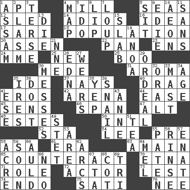 ACROSS 1. Fitting 4. Place where flour is made 8. Oceans 12. Downhill vehicle 14. Goodbye (Sp.) 16. The main thing one is thinking about 17. Indian skirt 18. Census information 20. NE Netherlands city 22. Baking dish 23. Followers of ems 24. Madame (abbr.) 25. ___ Haven, CT 28. Sometimes accompanies a hiss 30. Ancient Persian 31. Odor 35. Binary compound 37. Negative votes 40. To draw with force 41. Greek god of love 42. Sports stadium 44. Comfort 45. Elected reps. 46. Connect, as a bridge 47. Keyboard modifier key 48. _____ Park, CO 50. International (abbr.) 52. R.R. building 54. Area sheltered from the wind 55. Before (prefix) 58. White ___ sheet 61. Period 63. With great haste 65. Act in opposition 70. Inactive volcano in Sicily 71. Hero or heavy, e.g. 72. Thespian 73. For fear that 74. Inside; within (prefix) 75. Suttee (variant) 76. Born DOWN 1. Indian state 2. Suffix with ecto or cyto 3. Laconic 4. Atlas unit 5. Wedding promise 6. Mouth edge 7. Central Nebraska county 8. Be seated 9. Singer Brickell 10. A really long time 11. Without 13. Pass on 15. Thick slice 19. Small Philippine buffalo 21. Compass dir. 26. Pulitzer Prize-winning author Ferber 27. Puts on (as clothing) 29. Severe or trying experience 30. Makes clutter 32. Spoken 33. Vertical spar for supporting sails 34. Mature 35. Angers 36. Do not 38. Slangy assent 39. Slow-paced one 41. Compass dir. 43. Queen of England 1702-14 49. Proofreading order 51. Afternoon social gathering 53. Length times width 55. Eucharist need 56. Wash lightly 57. Maternal 58. Land measure 59. Within a short period 60. Old (Scot.) 62. Curves 64. Cartoonist voice _ Blanc 66. Modern: prefix 67. _ moment's notice (2 wds.) 68. Small bed 69. Three (prefix)