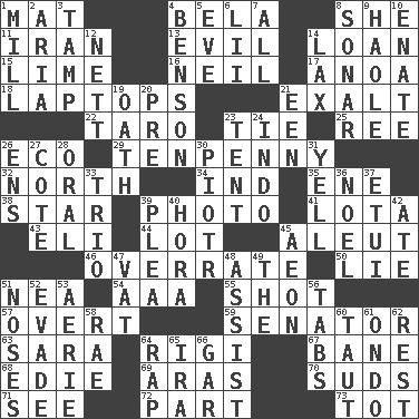 ACROSS 1. Floor covering 4. Actor Lugosi 8. A female animal or person 11. SW Asia republic 13. Morally bad or wrong 14. Grant temporary use of 15. Welles in "The Third Man" 16. Famous astronaut Armstrong 17. Small Philippine buffalo 18. Portable computers 21. Honor 22. Edible starchy tuberous root 23. Make a knot 25. To separate or throw off 26. Environmental prefix 29. 3-inch nail 32. Compass direction 34. Working for oneself (abbr.) 35. Compass dir. 38. Play the lead 39. Picture 41. Globular water bottle used in Asia 43. Connecticut Ivy Leaguer 44. Car dealer's back yard 45. Eskimo relative 46. Make much ado about nothing 50. Falsehood 51. Teachers' org. 54. Auto club (abbr.) 55. Opportunity 57. Unconcealed 59. Elected representative 63. "Two Mules for Sister ____" 64. Swiss mountan, "Queen of the Mountains" 67. Object of repulsion 68. Singer Brickell 69. Caspian sea tributary 70. Beer foam 71. Observe 72. Component 73. Small child DOWN 1. Place where flour is made 2. Roberta Peters solo 3. Pack (down) 4. Gillaume's butler role 5. First lady 6. Cards in a Roman deck? 7. Everything 8. Underwater navigation system 9. White Person, in Hawaii 10. Maternal 12. Remaining after all deductions 14. Not strict 19. Pledge 20. Before (prefix) 21. Car or cant ending 23. Portable shelter 24. Southeast Asian peninsula 26. Followers of ems 27. ____ d'Azur (French Riviera) 28. Of the mouth 30. Peter (Polish) 31. Shout 33. Musical group of three 36. Christmas carol 37. Needle case 39. Entreaty 40. Israeli folk dance 42. Had dinner 45. A really long time 47. Large container 48. Help 49. Definite Article 51. Olfactory organs 52. Dodge 53. Nest on high 56. Bar bills 58. Actress Charlotte 60. Tense 61. Southwest Nigerian state 62. Repose 64. Hit sharply and swiftly 65. Retirement account (abbr.) 66. Slender fish