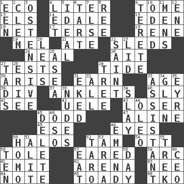 ACROSS 1. Environmental prefix 4. 61 cubic inches 9. Heavy book 13. Raised railways 14. Peak District village in England 15. Paradise 16. Fish or hair follower 17. Laconic 18. French philosopher Descartes 19. Cartoonist voice _ Blanc 21. Had dinner 22. Bobsleighs 24. Be tempered by heat 26. Small island 27. Trials 29. Periodic rise and fall of the sea level 30. Get up 31. Merit 33. Ripen 36. HTML Container Element 37. Short socks 40. Stealthy 41. Observe 42. Ubangi River tributary 43. Failure 45. Texas town _ City 47. Place in a line 48. Compass dir. 49. Sight organs 50. Auras 52. Scottish cap 54. Baseball player Mel 56. Lacquered or enameled metalware 57. Having ears or earlike features 59. Curve 61. Give off 62. Sports stadium 63. Born 64. Brief written record 65. Sycophant 66. Ring climax DOWN 1. Car or cant ending 2. To starve (Brit.) 3. Clearly or manifestly demonstrative 4. Allow 5. Standard of perfection 6. Small pie 7. Otherwise 8. To riddle 9. Cylindrical with tapered ends 10. Wrote a lyric poem 11. Not women's 12. Compass dir. 20. Allows 22. Inhabitant of Heaven 23. Flaplike covering 25. Toward the sea 27. Small amounts or degrees 28. 4th largest of the Great Lakes 29. Relationship diagram 31. Made supply last 32. 100% 33. Helper 34. Small, secluded valley 35. Jane of fiction 38. Unclothed pictures 39. Kill 44. Margarine 45. Keyboard key 46. Bear (Spanish) 49. Make improvements or corrections to 50. Like (prefix) 51. Came down and settled, as after flight 52. Edible starchy tuberous root 53. Length times width 55. Long journey 56. "___ Little Indians" 57. Erode 58. 24 hours 60. Corporate head (abbr.)
