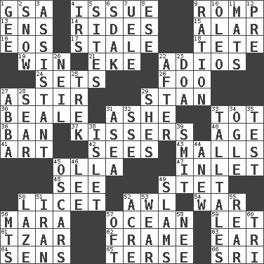 ACROSS 1. Girls' org. (abbr.) 4. Come out of 9. Frolic 13. Followers of ems 14. Amusement-park features 15. Having or resembling wings 16. Greek goddess of the dawn 17. Lacking originality or spontaneity 18. False hair 19. Acquire through effort 21. Make supply last 22. Goodbye (Sp.) 24. Arranges properly for use 26. Egg _ yung 27. Moving or stirring 29. Comedian Laurel of Laurel & Hardy 30. Memphis, Tenn. Street 31. American tennis player Robert 33. Small child 36. Bar 37. Smoochers 40. Mature 41. Nonscientific branch of learning 42. Observes 43. Promenades 45. Water jar 47. An arm off of a larger body of water 48. Perceive with the eye 49. Proofreading order 50. It is permitted: Lat. 52. Leather borer 54. Armed conflict 56. Hindu Mythology: god of death 57. Sea 59. Allow 61. Russian ruler 62. Movie unit 63. Hearing organ 64. Elected reps. 65. Laconic 66. _ Lanka DOWN 1. Unit of force equal to gravity 2. Frozen precipitation 3. Aide 4. Big collection agency 5. Locates 6. Neighbor of Neb. 7. Ubangi River tributary 8. Compass dir. 9. Food allowance for one day 10. Butter sub 11. Floor protectors 12. Before (prefix) 20. Famous astronaut Armstrong 22. Following 23. ___ good deed 25. Long journey 27. Swedish rock group 28. Scorch 29. "______ My Girl" (Turtles hit) 31. Toward the sea 32. Compass dir. 33. Baron Munchausen's specialties 34. Stare at amorously 35. Trial 38. Small island 39. Stricken, poetically 44. Afresh 45. Motion picture awards 46. Area sheltered from the wind 49. Criticizes harshly 50. Goldbrick 51. SW Asia republic 52. 1/640 square mile 53. Put on (as clothing) 55. Hitchcock's "____ Window" 56. Mountains (abbr.) 57. Often (poetically) 58. Born 60. Three (prefix)