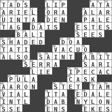 ACROSS 1. Small boys 5. Mouth edge 8. "One Day ___ Time" 11. Satellite of Uranus 13. Mouth or opening 14. Having or resembling wings 15. National forest in Provo, Utah 16. Lair 17. Light colored 18. Label 19. Raised platform 21. _____ Park, CO 22. Indonesian resort city 24. Perceives with the eye 25. Cast a shadow over 27. ___ good deed 29. Jacques of French films 30. In a vacuum (with "in") 32. In addition 33. Inhabitant of Heaven 35. "This won't hurt ____!" 39. Spanish missionary in California 41. Indian skirt 42. Untruth 43. Medicinal drug used to evoke vomiting 45. Monetary unit of Botswana 48. Keg 49. Composer Copland 50. Proofreading order 52. Scottish cap 55. Small bottle 56. Call ___ day 57. Peak District village in England 59. International (abbr.) 60. Pat or tap gently 61. High-strength synthetic material 62. Compass dir. 63. Followers of ems 64. Supplements with great effort DOWN 1. Tense 2. Operatic vocal solo 3. Empty-headed or silly people 4. Arrange properly for use 5. Farming town in central California 6. Angers 7. Baking dish 8. Having winglike extensions 9. Lies 10. Ancient Greek god of war 12. Dipping utensil 14. Domed church section 20. Assist 21. He sold his birthright 23. Goodbye (Sp.) 25. R.R. building 26. Actor Linden 27. One of the 12 tribes of Israel 28. Sep. follower 30. By way of 31. Fertile tracts in a desert 33. Indian title of respect (Mr.) 34. "We ___ not amused" (Victoria) 36. Sass 37. Lyricist Gershwin 38. Nervous spasm 40. Enthusiasm 43. Frozen water 44. Eucharist need 45. Aches 46. A salt of uric acid 47. Hang loosely or laxly 49. Opinion 50. Comedian Laurel of Laurel & Hardy 51. Bar bills 53. Medicinal plant 54. Not women's 56. Binary compound 58. Color