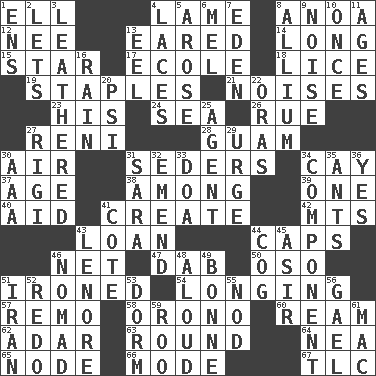 ACROSS 1. Pipe bend 4. Unable to walk 8. Small Philippine buffalo 12. Born 13. Having ears or earlike features 14. Protracted 15. Play the lead 17. Learning spot: Fr. 18. Louse (plural) 19. Paper fasteners 21. Annoying sounds 23. Part of HMS, perhaps 24. Ocean 26. Sorrow 27. Painter Guido (1575-1642) 28. Island territory of the United States 30. Wind 31. Spring feasts 34. Island 37. Mature 38. Amid 39. Single 40. Help 41. Cause to be 42. Mountains (abbr.) 43. Grant temporary use of 44. Smile enhancers 46. Fish or hair follower 47. Small moist lump or mass 50. Bear (Spanish) 51. Pressed 54. Yearning 57. San ____ (Riviera town) 58. U. of Maine site 60. 480, 500 or 516 sheets of paper 62. The sixth month of the Jewish calendar 63. Single shot of ammunition 64. Teachers' org. 65. Thickened enlargement 66. Method 67. Affectionate concern, for short DOWN 1. Followers of ems 2. Allows 3. Resembling or made to resemble leather 4. Shoestrings 5. Came up 6. Cartoonist voice _ Blanc 7. Genesis locale 8. Plant genus of onion and garlic 9. Annoying sound 10. At one time in the past 11. Eons 13. Snakelike fish 16. Precipitation 20. Air pressure measure (abbr.) 22. Mouths or openings 25. Representative 27. Swiss mountan, "Queen of the Mountains" 29. Goad 30. Auto club (abbr.) 31. "Two Mules for Sister ____" 32. Make improvements or corrections to 33. ___ good deed 34. Part 35. Pismires 36. Affirmative reply 41. ____ d'Azur (French Riviera) 43. Poe poem 44. Gear tooth 45. SW Saudi Arabia district 46. Wanderer 48. Verbally 49. Maid-servant 51. SW Asia republic 52. Redecorate 53. Dormintory (informal) 55. Lower and raise head in agreement 56. Highlander 59. Friend of Pooh 61. Apple computer (short form)