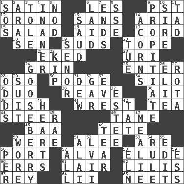 ACROSS 1. Smooth fabric 6. French article 9. Pacific Standard Time (abbr.) 12. U. of Maine site 13. Without 14. Roberta Peters solo 15. First course 16. Assistant 17. Drawstring 18. Elected rep. 19. Beer foam 20. Drink excessively 21. Made supply last 23. RI univ. 24. Amused look 25. Keyboard key 28. Bear (Spanish) 30. Puddle 34. Grain storage tower 35. Superhero pair 36. Break or tear apart 38. Small island 39. Food container 41. Take or capture by force 43. Afternoon social gathering 44. Guide 46. Not wild 48. Sound made by sheep 49. Wig 50. We are 51. Toward shelter 53. "We ___ not amused" (Victoria) 56. Left side of a ship or aircraft 57. Inventor's middle name 58. Dodge 60. Blunders 61. Den 62. Ms. Damita and namesakes 63. Marina Del _, California 64. Cards in a Roman deck? 65. Confronts DOWN 1. Mayday 2. Caspian sea tributary 3. Lacquered or enameled metalware 4. More empty; more void 5. Dreamland 6. Put down 7. Extremities 8. Compass dir. 9. Appease 10. Title for a man of rank and authority 11. Small boy 13. Saudi Arabian king (1953-1964) 14. Oak nuts 19. Sir (Sp.) 20. Third day of the wk. 22. Sleep 24. Sour, prickly fruit 26. Writer Wiesel 27. Round or rotation of duties 28. Likelihood 29. Set of matching outer garments 31. Morning condensation 32. Slender fish 33. Night before a holiday 37. First name in cosmetics 40. Centers 42. Make lace 45. Actress Charlotte 47. Ear of corn 49. Pull apart 50. Had on 51. Jai ____ 52. 57 in ancient Rome 54. Governing power 55. Prepare for publication 56. For each 57. 100% 58. Shade tree 59. Double-curved letter