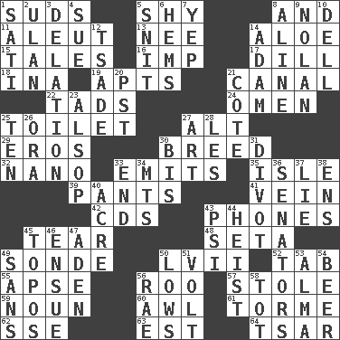 ACROSS 1. Beer foam 5. Like a shrinking violet 8. Plus 11. Eskimo relative 13. Born 14. _ vera 15. Lies 16. Naughty child 17. Deli pickle 18. _ tizzy (2 wds.) 19. Tenement units (abbr.) 21. Lessep's creation 22. Bits 24. Sign of things to come 25. Rest room 27. Keyboard modifier key 29. Greek god of love 30. A special lineage 32. Billionth: prefix 33. Gives off 35. Capri or Wright 39. Leg coverings 41. Distinctive style or manner 42. Music discs 43. Gives a jingle 45. Separate forcefully 48. Stalk of a moss capsule 49. Message 50. 57 in ancient Rome 52. Bar bill 55. Domed church section 56. Friend of Pooh 57. Fur scarf 59. Part of speech 60. Leather borer 61. Singer Mel 62. Compass dir. 63. Eastern Standard Time (abbr.) 64. Russian ruler of old DOWN 1. Suttee (variant) 2. ____ Bator, Mongolia 3. Conveyance 4. Take to court 5. In a ____ (agitated or irritated) 6. Equivocates 7. Slangy assent 8. Place in a line 9. Pitcher Ryan 10. Small valley 12. Sadhe (variant) 14. First of billions? 20. Pacific Standard Time (abbr.) 21. ____ d'Azur (French Riviera) 23. Columnist Joseph or Stewart 25. Nine, plus one 26. Mouth or opening 27. Tate display 28. French article 30. Again 31. A piece of turf (Scot.) 33. Conclude 34. Mountains (abbr.) 36. Elected representatives 37. Untruth 38. Followers of ems 40. 43,560 square feet 43. Air pressure measure (abbr.) 44. Robbery 45. Traditional theme or motif 46. Follow as a consequence or result 47. Arabian gulf 49. Without 50. Coldest temperatures 51. Electrical Unit 53. _ mater 54. Fermented drink made from hops 56. Actress Charlotte 58. Small child
