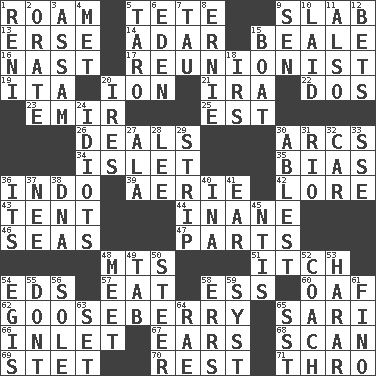ACROSS 1. Wander 5. False hair 9. Broad, flat, thick piece 13. Celtic language 14. The sixth month of the Jewish calendar 15. Calif. Air Force Base 16. Political cartoonist Thomas 17. One who advocates reunion 19. Call ___ day 20. Electrically charged atom 21. Retirement account (abbr.) 22. Two (Sp.) 23. Independent ruler or chieftain 25. Eastern Standard Time (abbr.) 26. Allots cards 30. Curves 34. Small island 35. Prejudice 36. _ china 39. Nest on high 42. Old wives' tales, e.g. 43. Portable shelter 44. Empty; void 46. Oceans 47. Components 48. Mountains (abbr.) 51. Hankering 54. Begley and Asner 57. Erode 58. Curvy letter 60. Clumsy lout 62. Sour, prickly fruit 65. Indian skirt 66. An arm off of a larger body of water 67. Hearing organs 68. Examine minutely or intensely 69. Proofreading order 70. Relief 71. Through, poetically DOWN 1. Painter Guido (1575-1642) 2. Speak pompously 3. Indian state 4. Was introduced to 5. Pacific island yam 6. Locale of original sin 7. The 19th letter of the Greek alphabet 8. Bert's buddy 9. Elected rep. 10. Put down 11. In addition 12. Stakes 15. Water vessel 18. Big collection agency 20. Angers 24. Foolish or stupid persons 27. Chicken ___ king 28. Area sheltered from the wind 29. Empty completely 30. Most capable 31. River (Sp.) 32. Auto 33. Compass dir. 36. ___ a Wonderful Life 37. Born 38. Heredity factor (abbr.) 40. _ tizzy (2 wds.) 41. Ewer handle 45. Nuclear Threat Initiatives 48. Rendezvous 49. Bar bill 50. Guide 52. Team commander 53. Ethiopian city, capital of Harari 54. The front part of a cuirass 55. Do not 56. Not divided or shared with others 58. Blunders 59. System (abbr.) 61. Fine (Spanish) 63. Arrange properly for use 64. Actress Charlotte 65. Fast jet (abbr.)