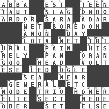 ACROSS 1. Swedish rock group 5. Eastern Standard Time (abbr.) 8. Adolescent 12. Strained 13. Volcanic refuse 15. Southwest Nigerian state 16. Zeal 18. "Two Mules for Sister ____" 19. The sixth month of the Jewish calendar 20. Fish or hair follower 22. Mood resulting from idleness 24. At once, immediately (arch.) 26. 24 hours 27. Globular water bottle used in Asia 28. Dripping 29. Three (prefix) 32. Mountain range 35. Ache 37. Part of HMS, perhaps 38. Have trust in 39. Baking dish 40. NW Algerian seaport 41. Thick or sticky substance 42. Froth on beer 43. Electrical Unit 44. Compass dir. 45. Directed 46. Stare 49. Ocean 50. Erode 51. Commissioned military rank 55. And so on (abbr.) 56. Connecting point 57. Musical group of three 59. Homing pigeon 63. Writer Wiesel 64. Religious group 65. Ancient Persian 66. River in Europe 67. Put into a specified state 68. Otherwise DOWN 1. "One Day ___ Time" 2. Oblong piece of solid material 3. Partially opened flower 4. Lacking a tonal center or key 5. Double-curved letter 6. Thick slice 7. Edible starchy tuberous root 8. Sycophant 9. Inside; within (prefix) 10. Dutch treat 11. Not either 14. Place where plants grow 17. Former U.S. Attorney General Janet 21. Small child 23. Ingest 25. Slept 28. Light entry point 29. Through, poetically 30. Monetary unit of Yemen 31. Is not 32. Goad 33. Vintage cars 34. _ vera 36. Auto club (abbr.) 40. Conquer 42. Centers of feelings and intuitions 45. Area sheltered from the wind 47. Unit of force equal to gravity 48. Thin strip of wood or metal 49. Contemptuous expression 51. Aureate 52. Singer Brickell 53. Ancient Greek god of war 54. Louse (plural) 56. Modern: prefix 58. Baseball player Mel 60. Cartoonist voice _ Blanc 61. Begley and Asner 62. To sift